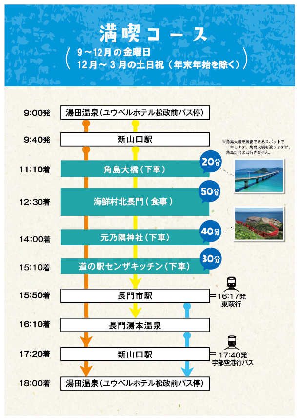 ◆満喫コース ~9月~12月の金曜日、12月~3月の土日祝(年末年始を除く)~ 湯田温泉ユウベルホテル松政前バス停(9:00発)→ JR新山口駅(9:40発)→角島大橋(下車)[20分]→【昼食】海鮮村北長門[50分]→ 元乃隅神社[40分]→道の駅 センザキッチン[30分]→ JR長門市駅(15:50着)→ 長門湯本温泉(16:10着)→ JR新山口駅(17:20着)→ 湯田温泉(18:00着)