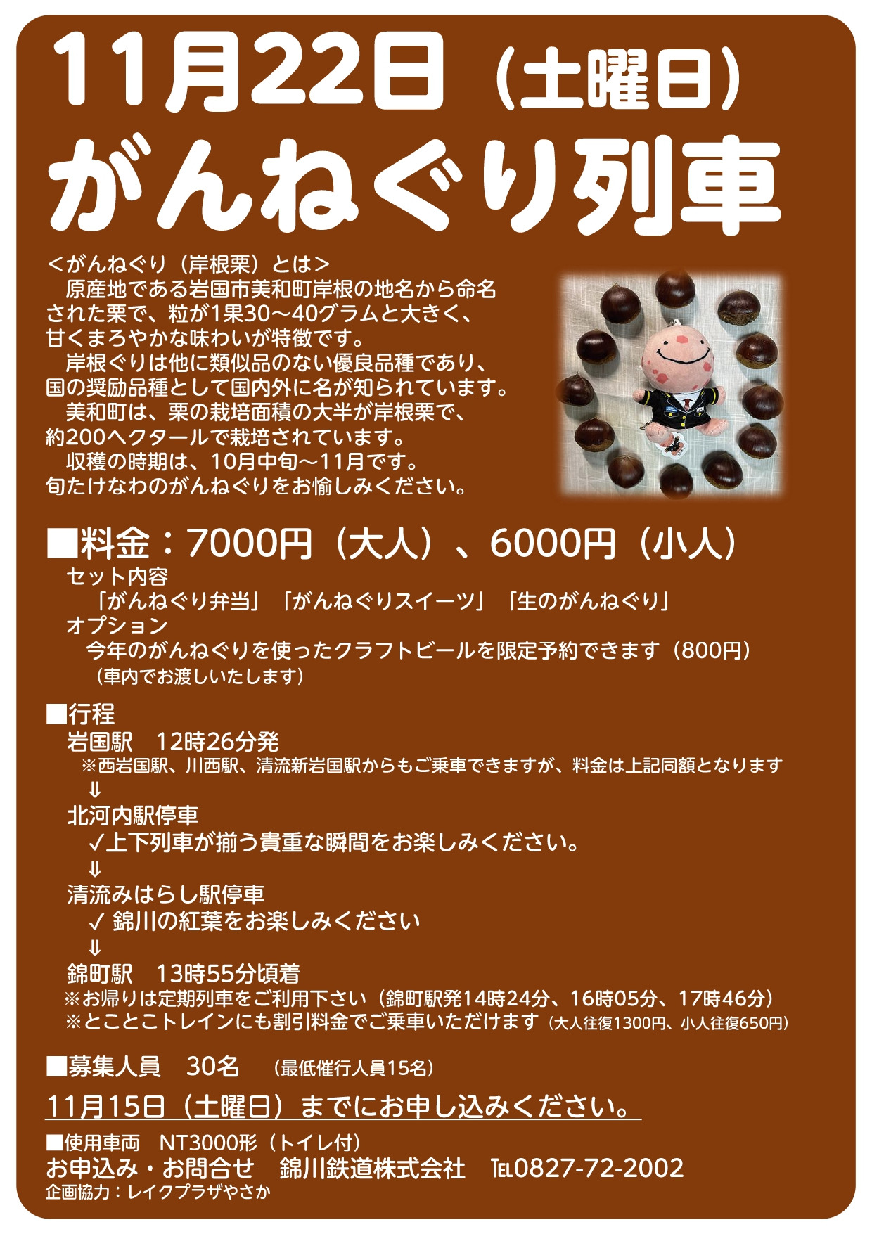 がんねぐりとは、岩国市美和町岸根の地名から命名された栗で、粒が1果30~40グラムと大きく、強い甘みとなめらかな食感が特徴。この栗をふんだんに使ったお弁当やスイーツ、お土産が付いたこの時期ならではの岩国の秋を堪能できる列車ツアーです。