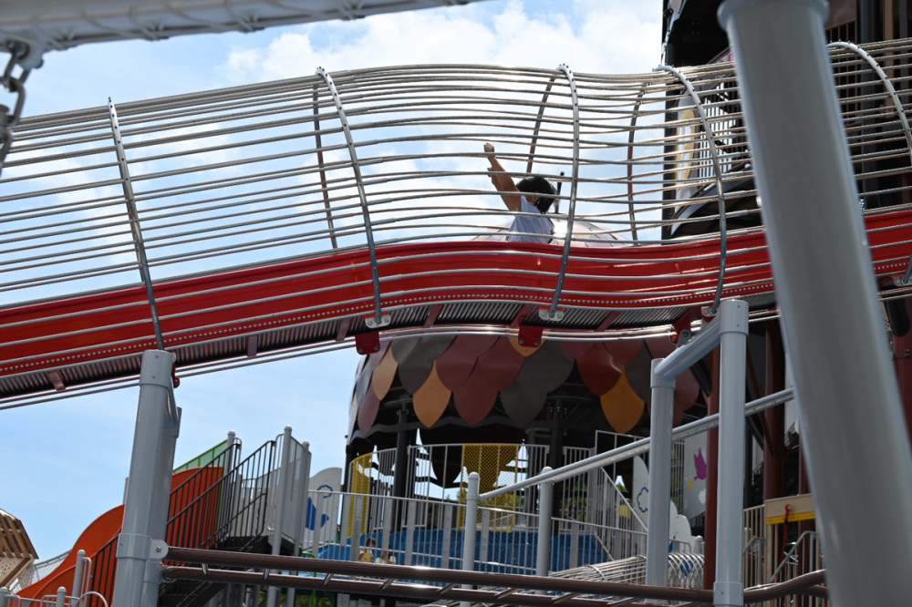 ローラースライダーやターザンロープ、マウンテンネットなどの遊具が並びます。