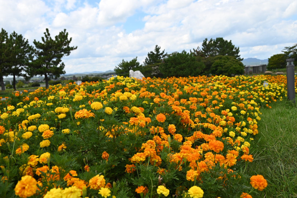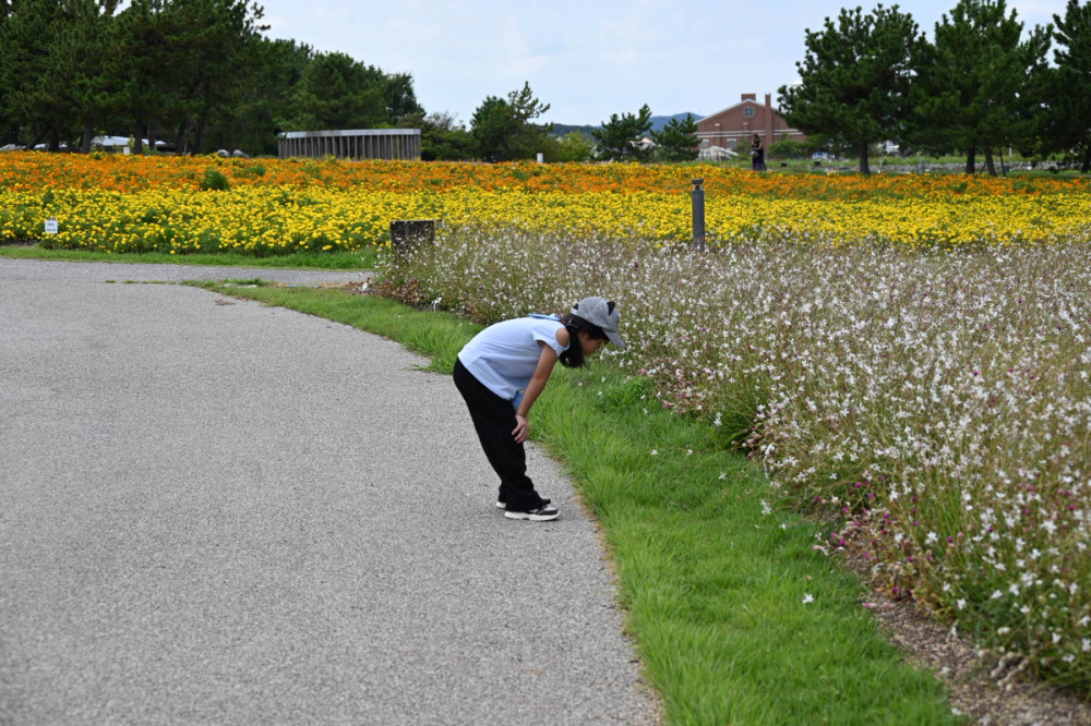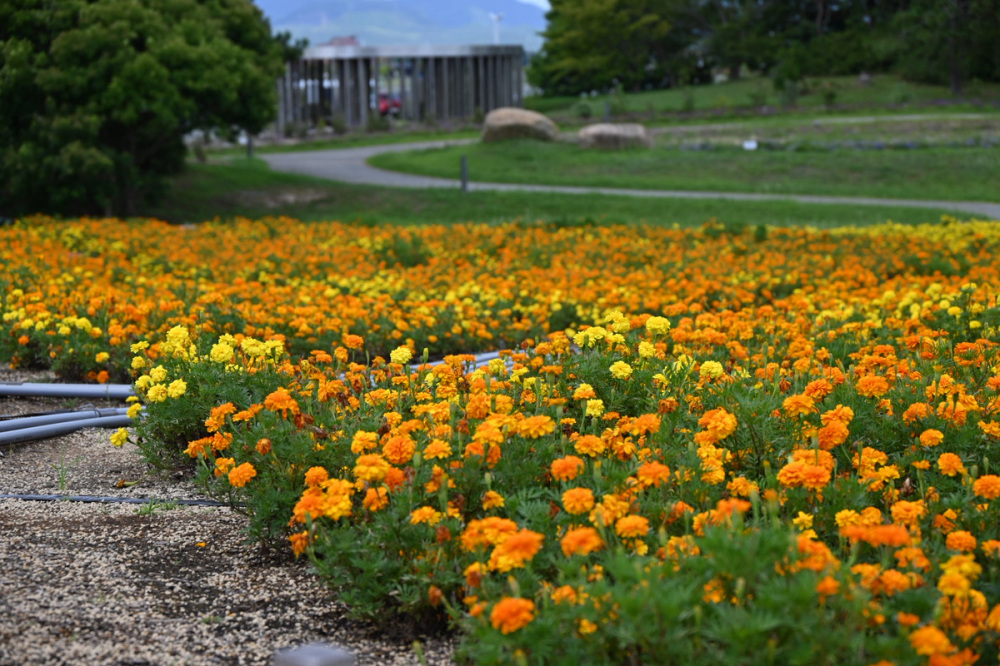 マリーゴールドのオレンジと黄色が鮮やかで、ゆったりと歩きたくなります。花に引き寄せられるように虫たちもいて、子どもは虫にも夢中でした。