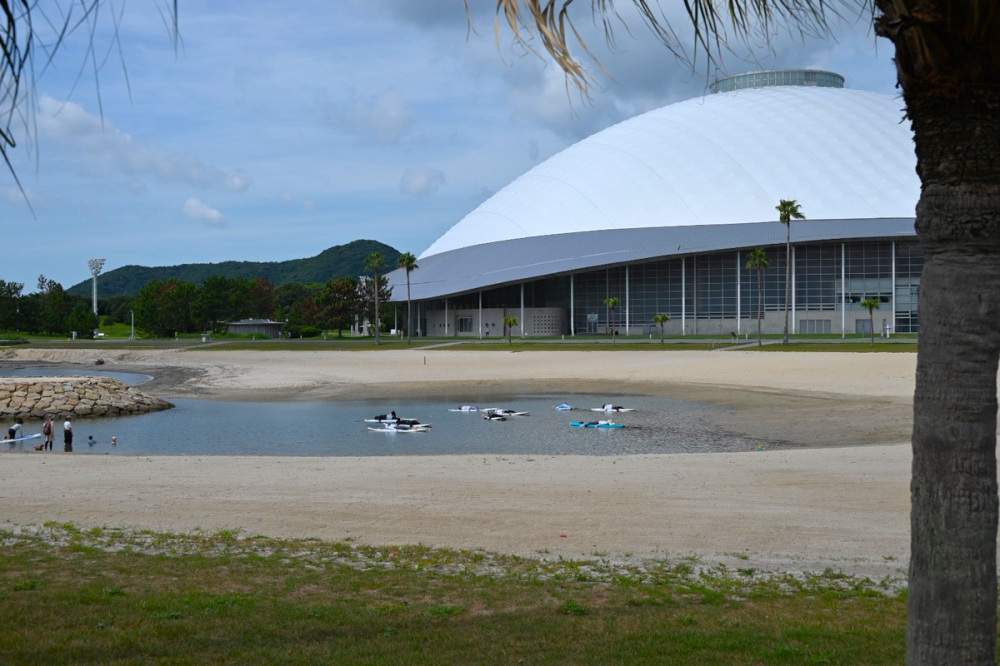 朝は浅瀬でSUPヨガが行われていました。体験で使うのは整備された内海で、子どもも安心して入れる深さの場所と、水深2mほどになる2つのタイプ。