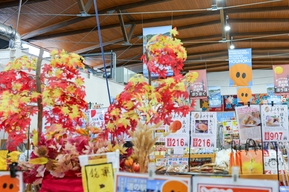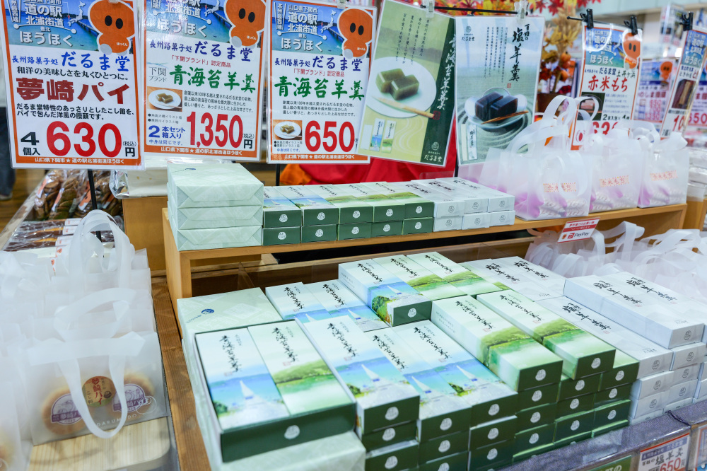 下関市北部の豊北町にあり、人気観光スポット・角島大橋から車で約10分の「道の駅北浦街道ほうほく」でお菓子をピックアップ。週末はほとんど毎日イベントが開催されており、多くの人で賑わいます。