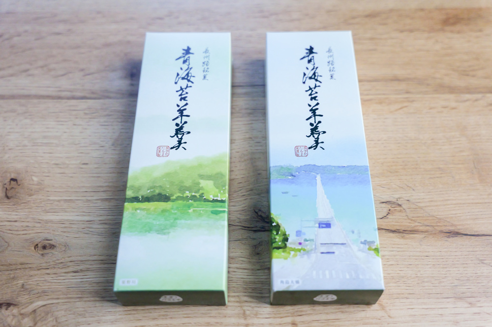 パッケージは2種類あり、鮮やかな水色が目を引く角島大橋のデザインも。今回の羊羹の賞味期限は購入日から約170日後となっており、日持ちが長いため贈り物にもぴったりです。
