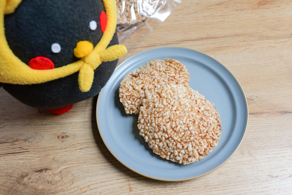 さしみ吟醸醤油味のおせんべいは、食欲をそそられる香ばしい色合い。揚げられたお米のパリッとした食感と、さしみ醤油ならではの甘じょっぱい味わいがクセになります。パッケージには「道の駅北浦街道ほうほく」のマスコットキャラクターであり、下関市豊北町観光大使の「ほっくん」も描かれていて、ファミリーへのお土産にもぴったり!