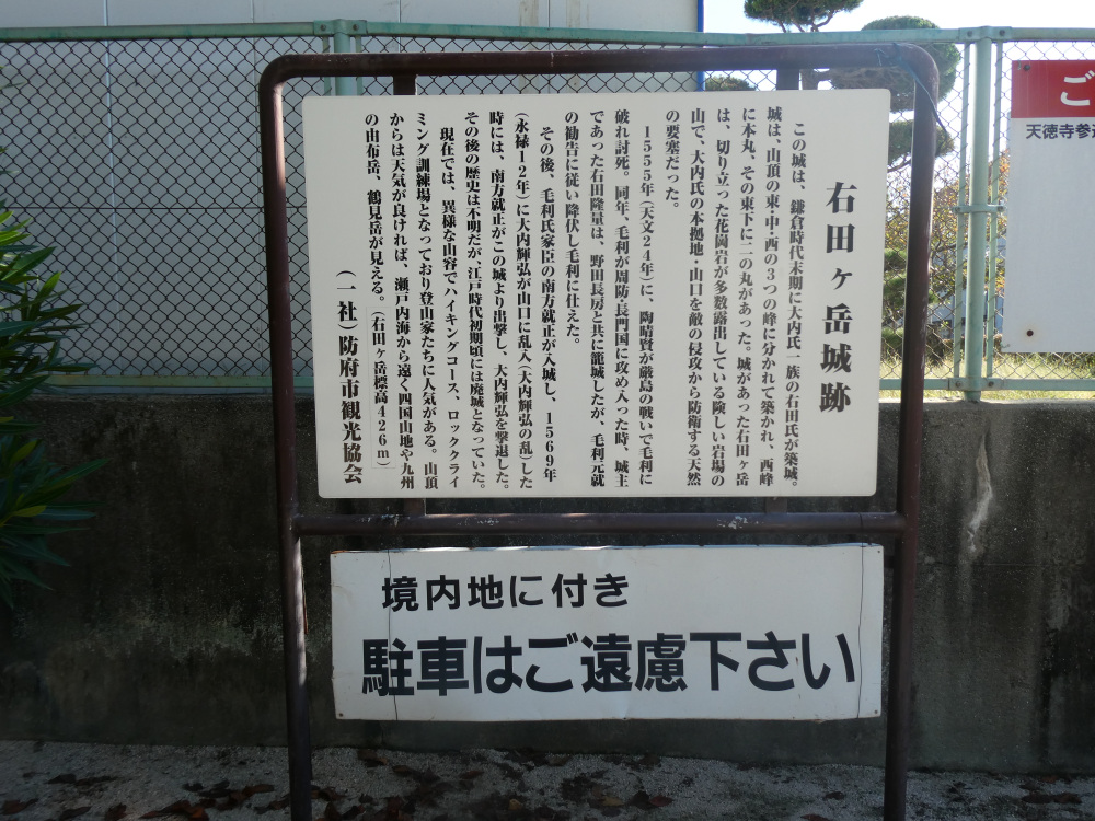 右田小学校脇の通りから天徳寺に続く道を進んで行くと、途中に右田ヶ岳城跡について書かれた看板がありました!現在はお城の礎石や石垣など残っていないそうですが、あんな岩山の頂上にお城があったとは驚きです