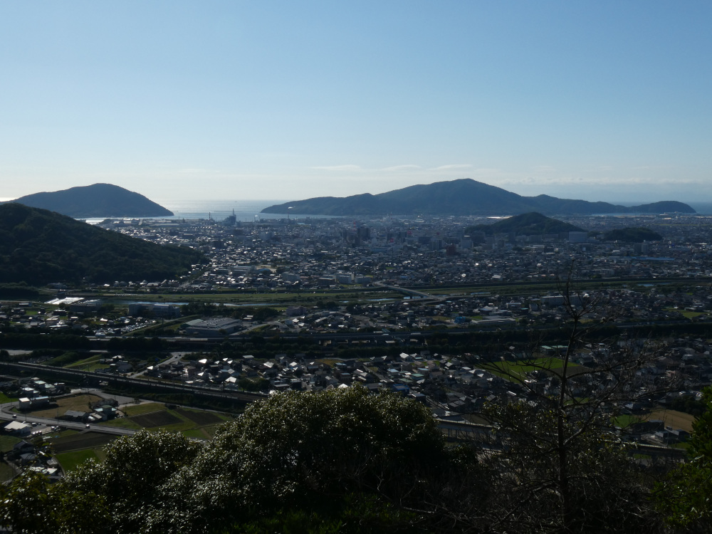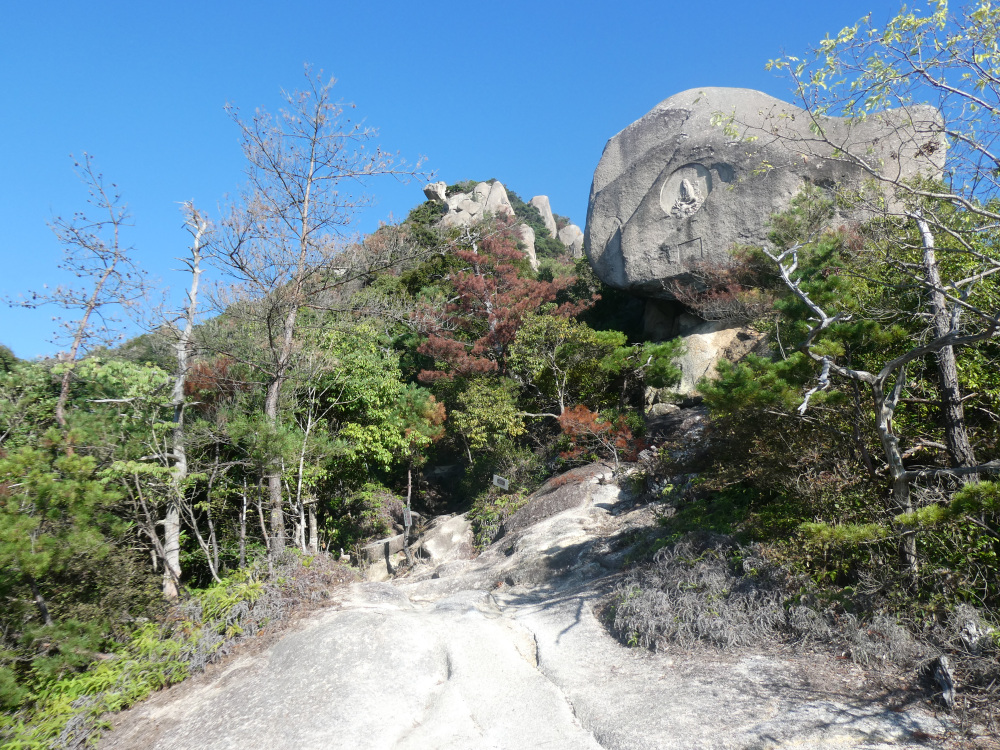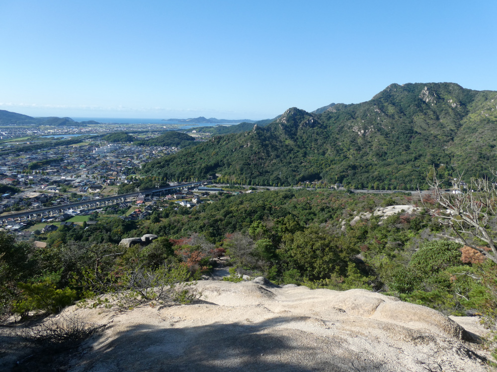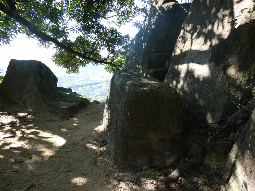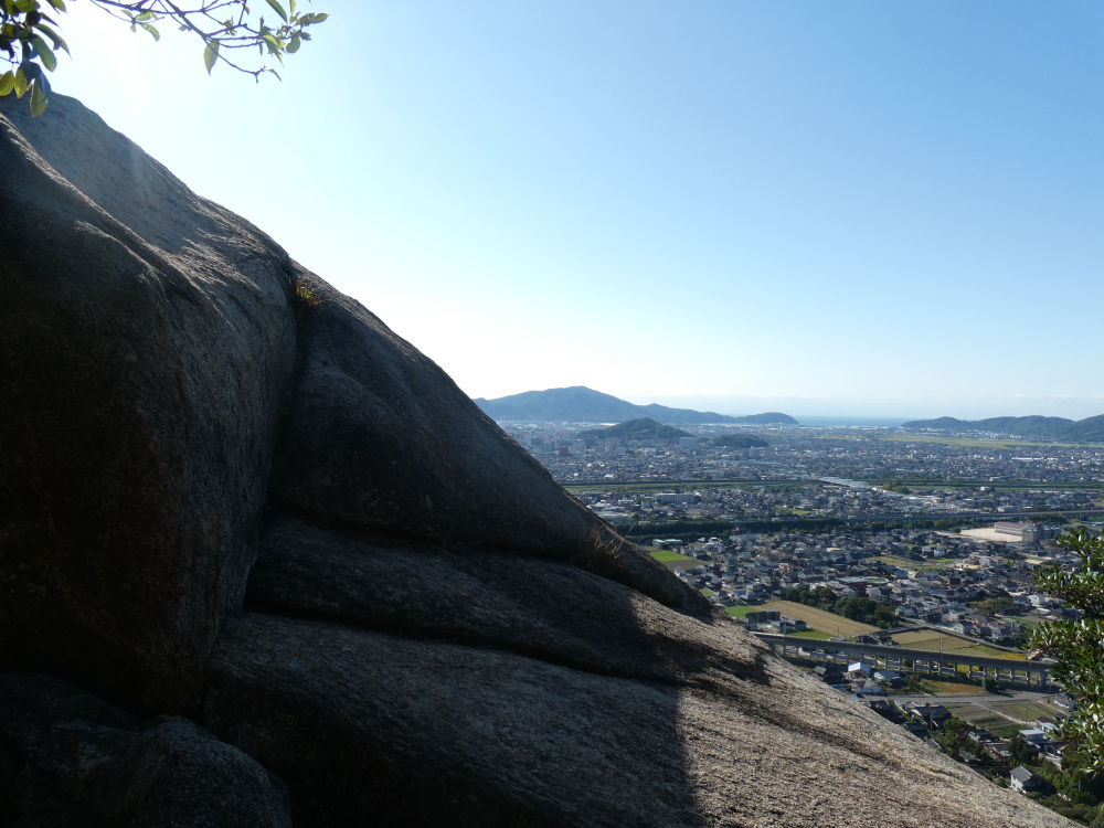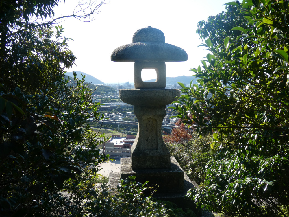 さらに進むと、防府の景色が一望できる岩場に出てきます。岩場の先には大きな石灯篭が立っており、防府の景色と相まって絵になる風景になっています。