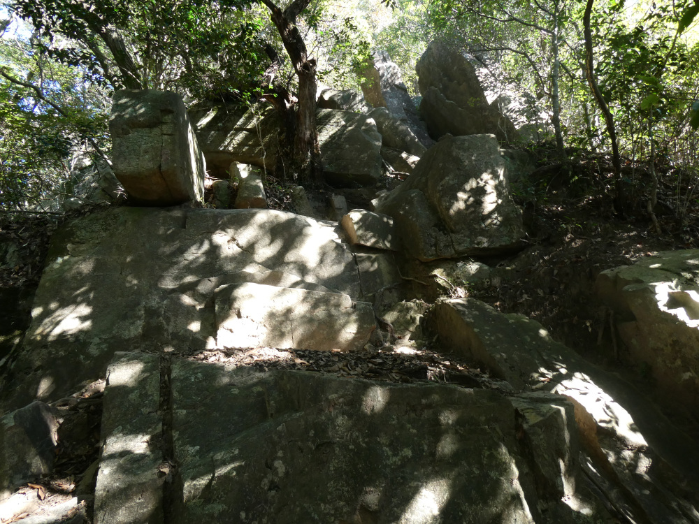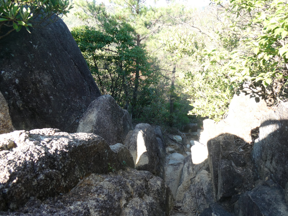 登山道では、少し開けた岩場や、木陰に座って休憩できる「岩の椅子」のような場所も現れます。