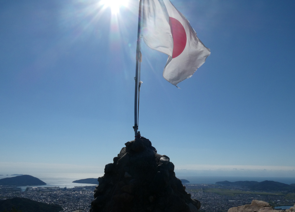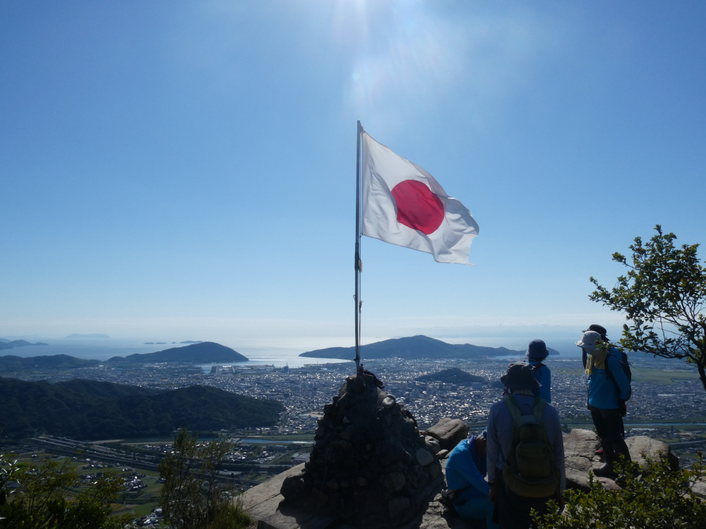 ついに右田ヶ岳の頂上に到着です!遠目に目指していた国旗が目の前で力強くはためいています。