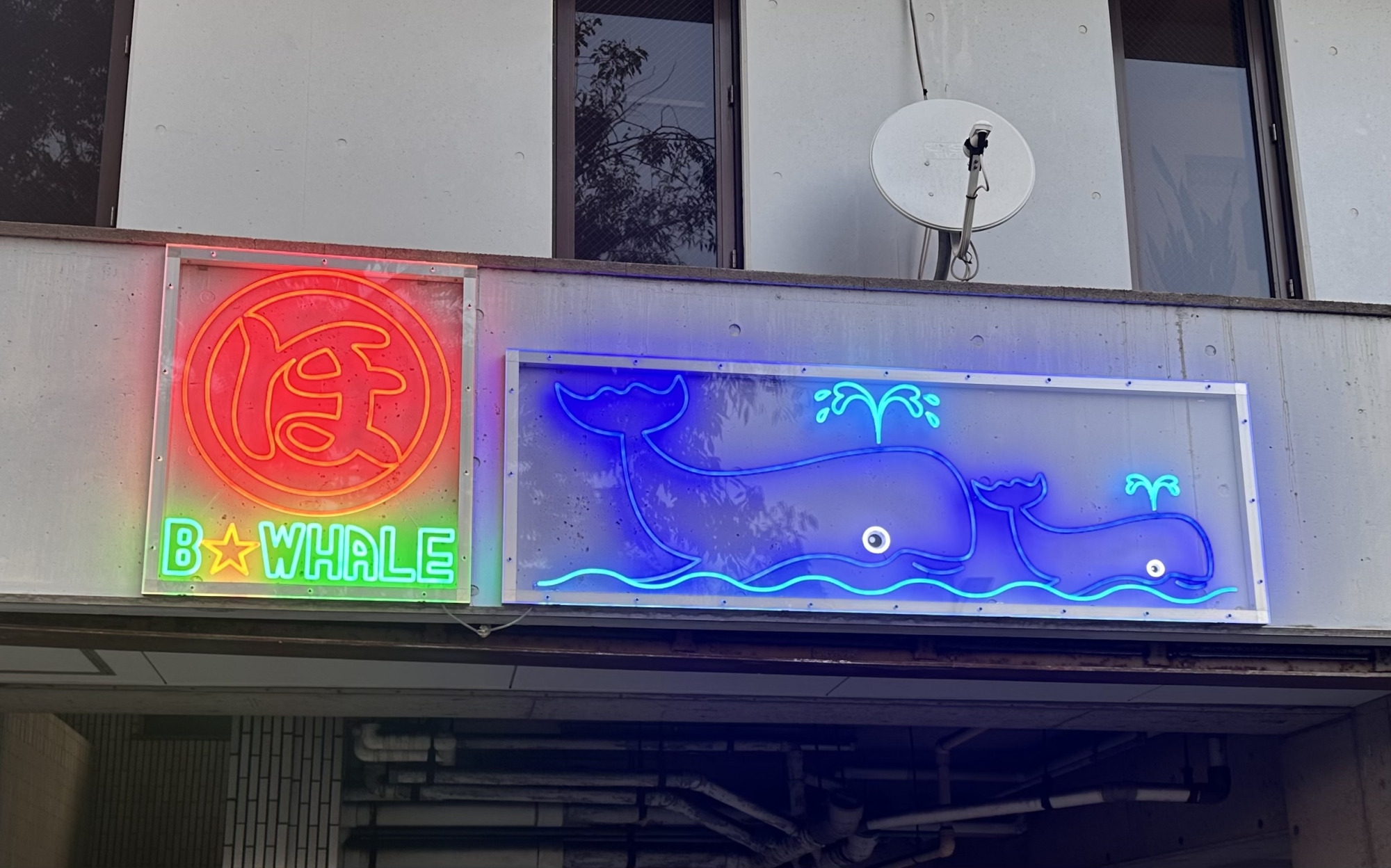 随所にベイスターズ愛が溢れるB☆WHALEの外壁には、親子クジラのネオンサインも✨