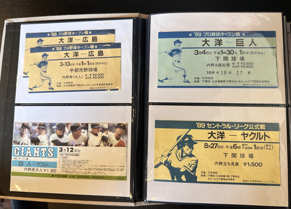 大洋ホエールズ時代からの観戦チケットをファイリングしたものなど、歴史を感じる貴重なアイテムも並びます。