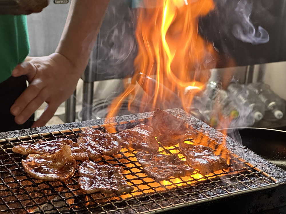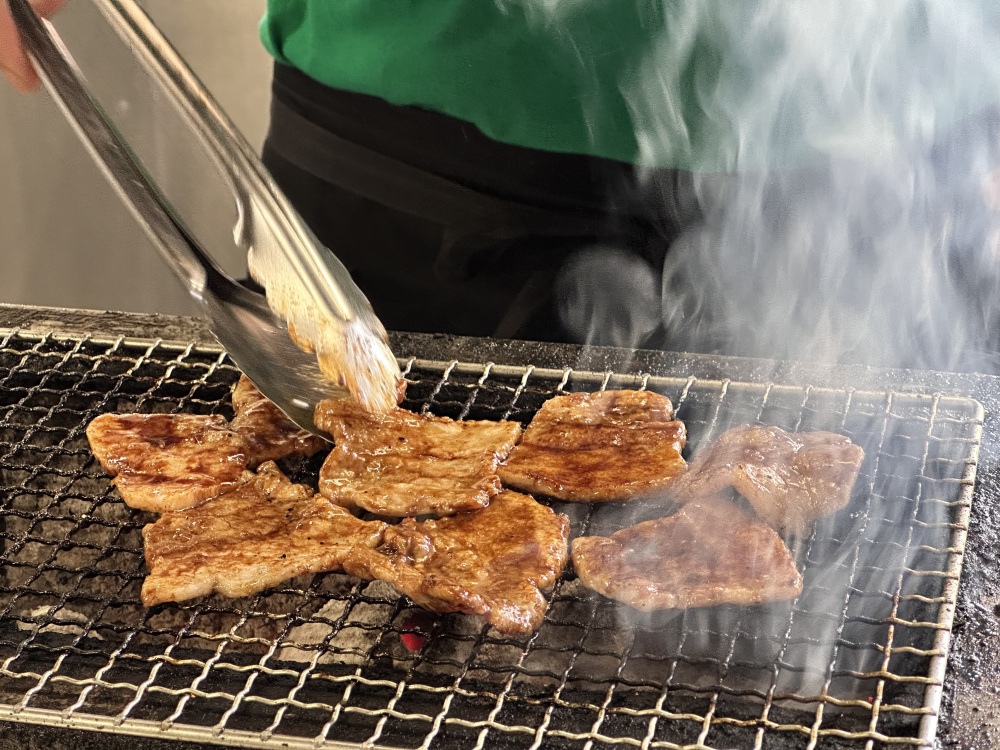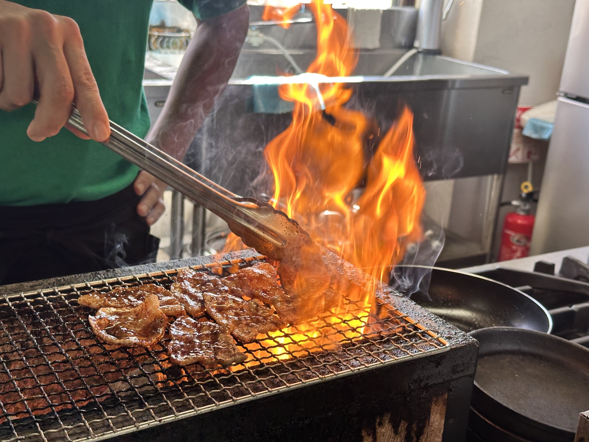 絶妙な焼き加減で、ジューシーで柔らかく、炭火の香ばしさもしっかり感じられる豚肉は、一度食べるとやみつきになること間違いなし!
