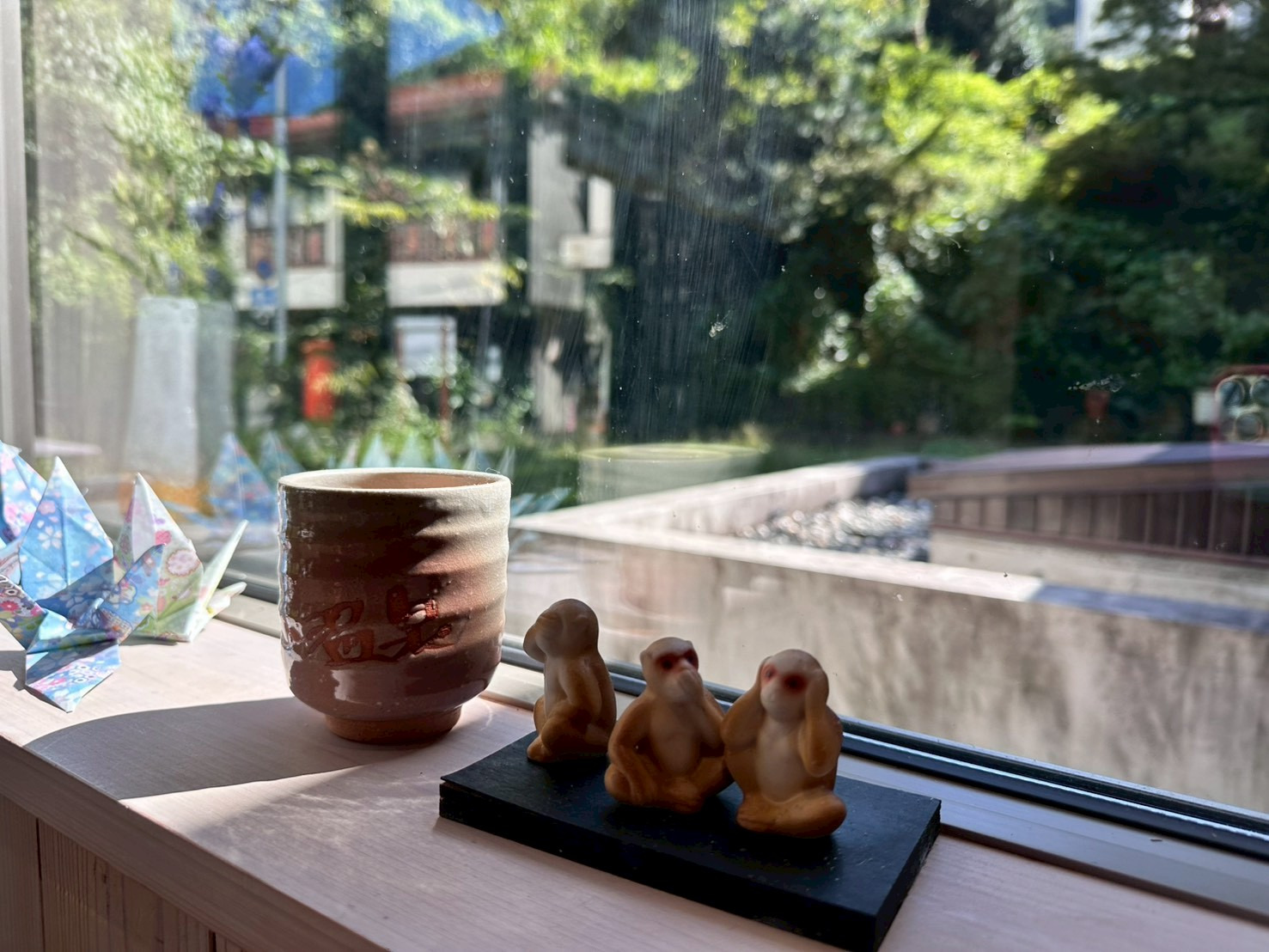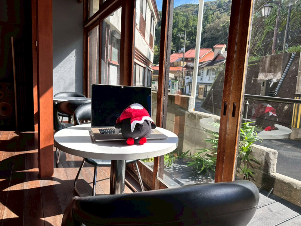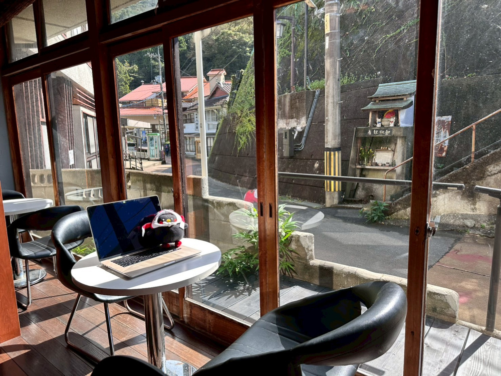 窓の外に広がる温泉街を眺めながら、やわらかな日差しの中で仕事をする時間はとっても穏やか。
