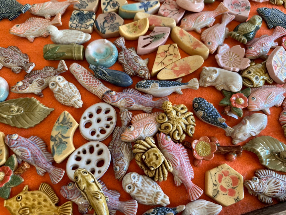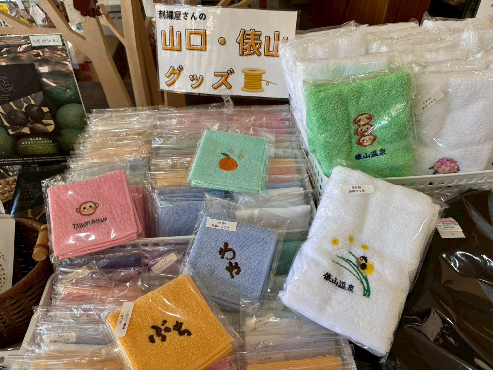俵山温泉の入浴剤やゆずきちを使ったフェイスパック、俵山温泉オリジナルのかわいいタオルのほか、鮮やかな焼き物もリーズナブルなお値段で並んでいました。