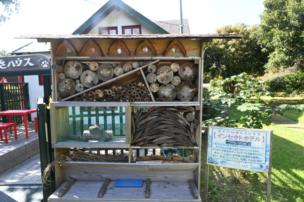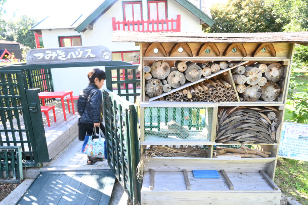 「つみきハウス」と書かれたかわいらしい小屋の前には、「インセクトホテル」と呼ばれる木製の小さな宿がありました。