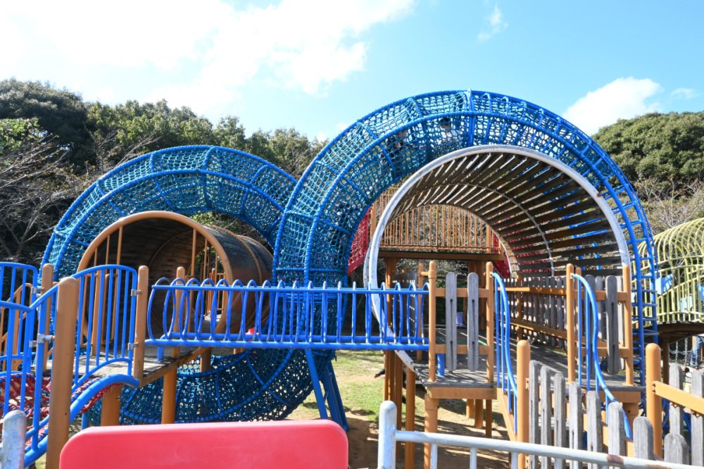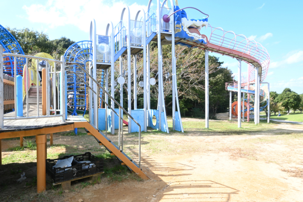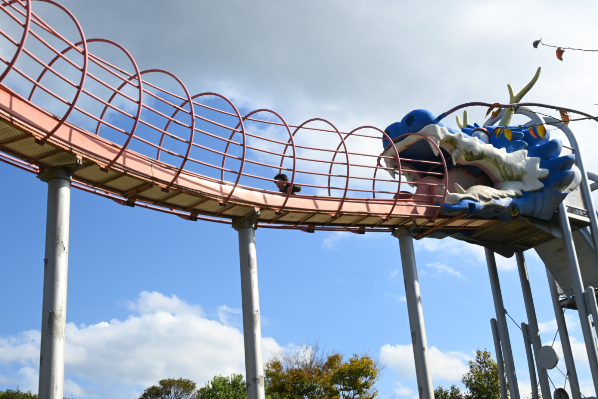 遊具広場のメインは、川棚温泉の青龍伝説にちなんで青い龍をモチーフにしたロングローラーコースター。