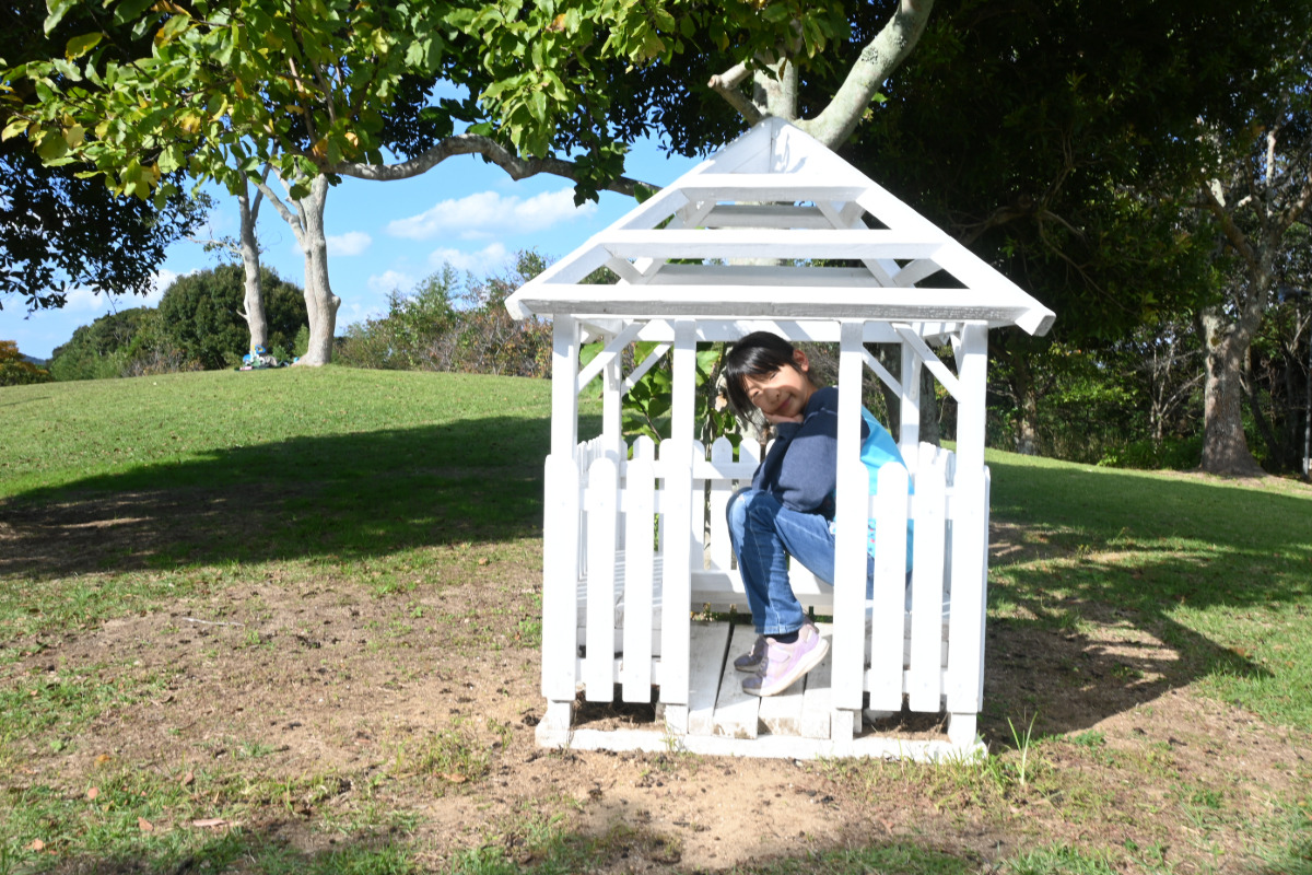 遊具広場のまわりには、東屋やベンチが点在していて、どこにいてもひと休みできるのがうれしいポイント。