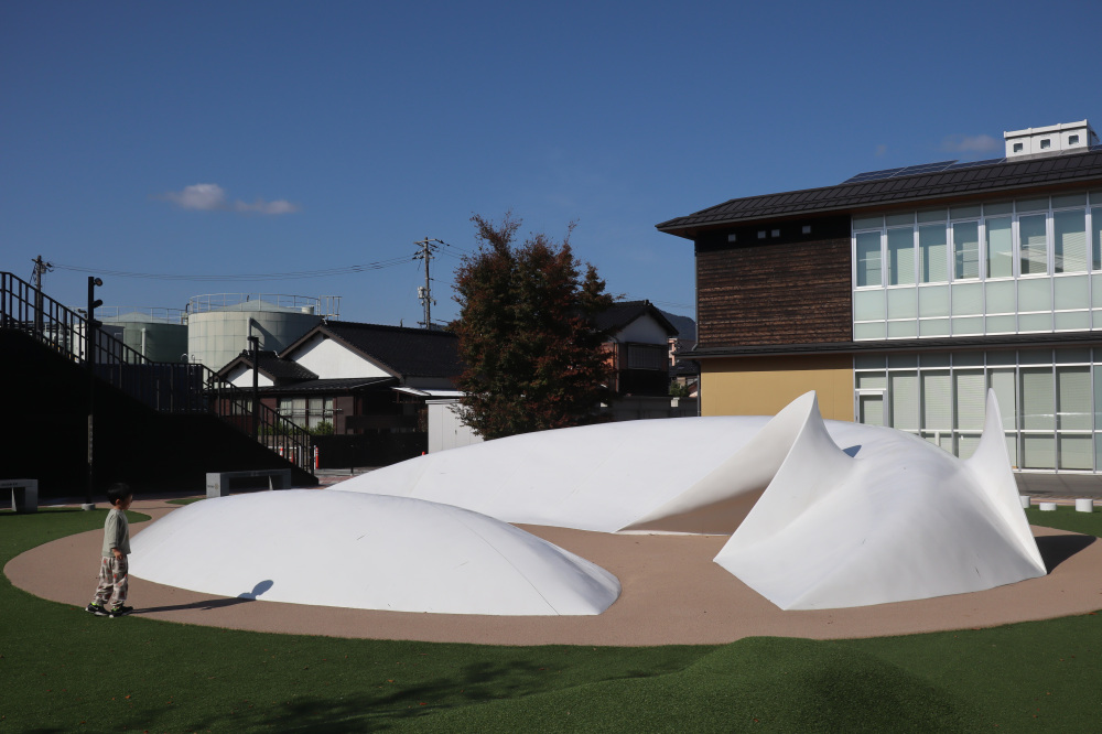 白狐をモチーフにした大型遊具が印象的な芝生広場や、噴水が子どもたちに人気の水遊びエリア、開放的な屋外カフェスペースも。自然の中でのびのび過ごせる癒しの空間が広がっています。