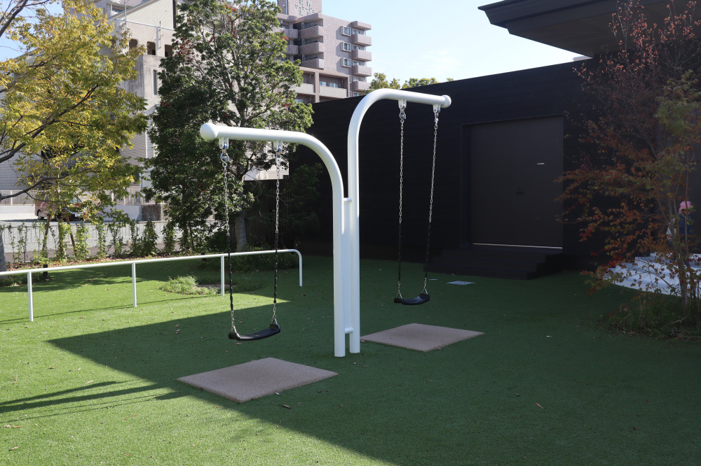 芝生広場には、湯田温泉の象徴である白狐をモチーフにした個性的な遊具やブランコがありました。