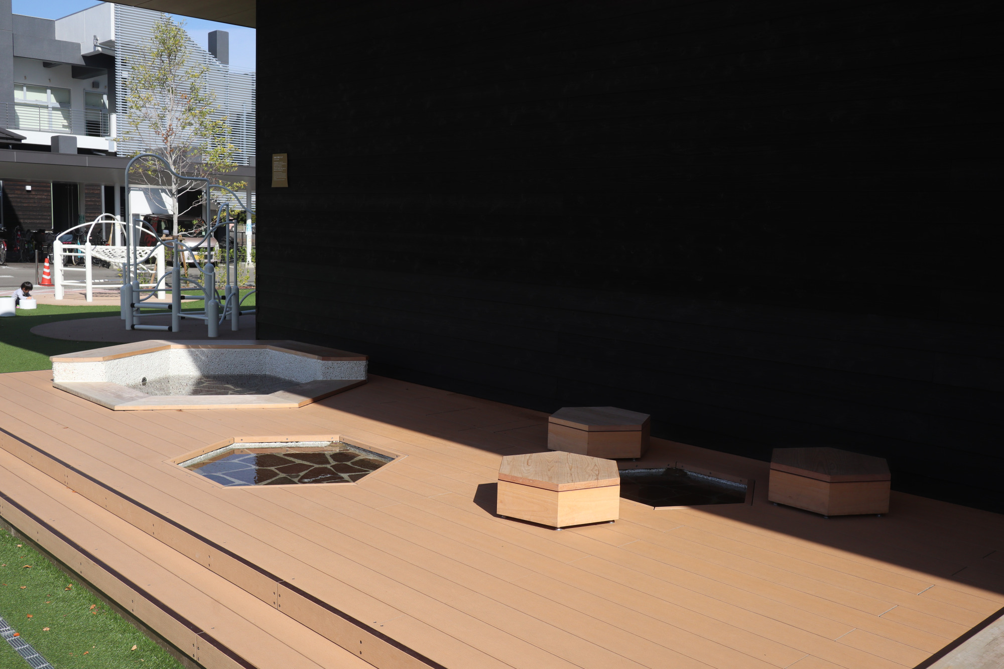 すぐそばには足湯スペースがあり、お湯に足を浸しながら子どもの遊ぶ姿を見守る親の姿も。