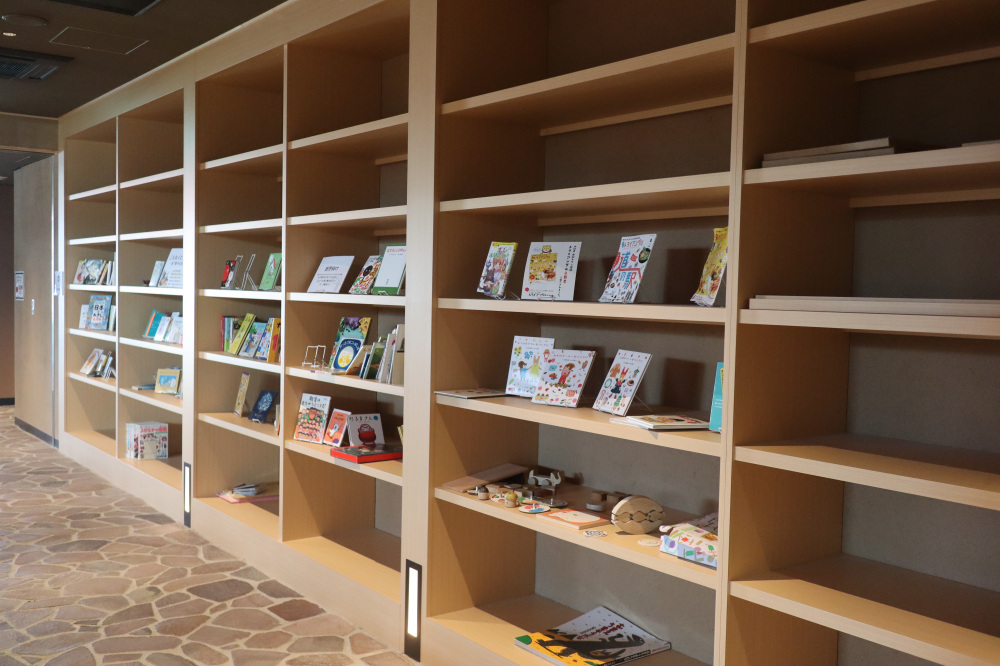 また、温浴棟からこんこん広場へ向かう途中にも畳スペースがあり、本棚には絵本から文庫本まで多彩なジャンルの本が並びます。