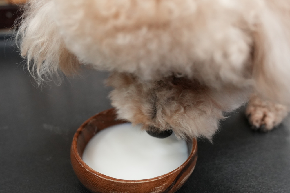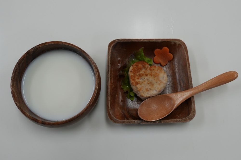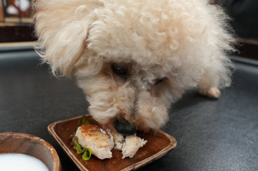 そして愛犬テオには、ドッグメニューで一番人気のヤギミルクSサイズ(50ml)110円、鶏と里芋のハンバーグSサイズ(約20g)350円を頼んでみました。