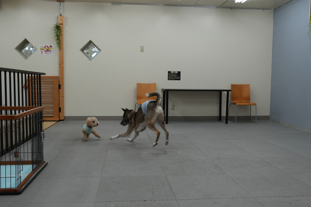 早速、広い室内ドッグランで仲良く追いかけっこをして遊んでいました