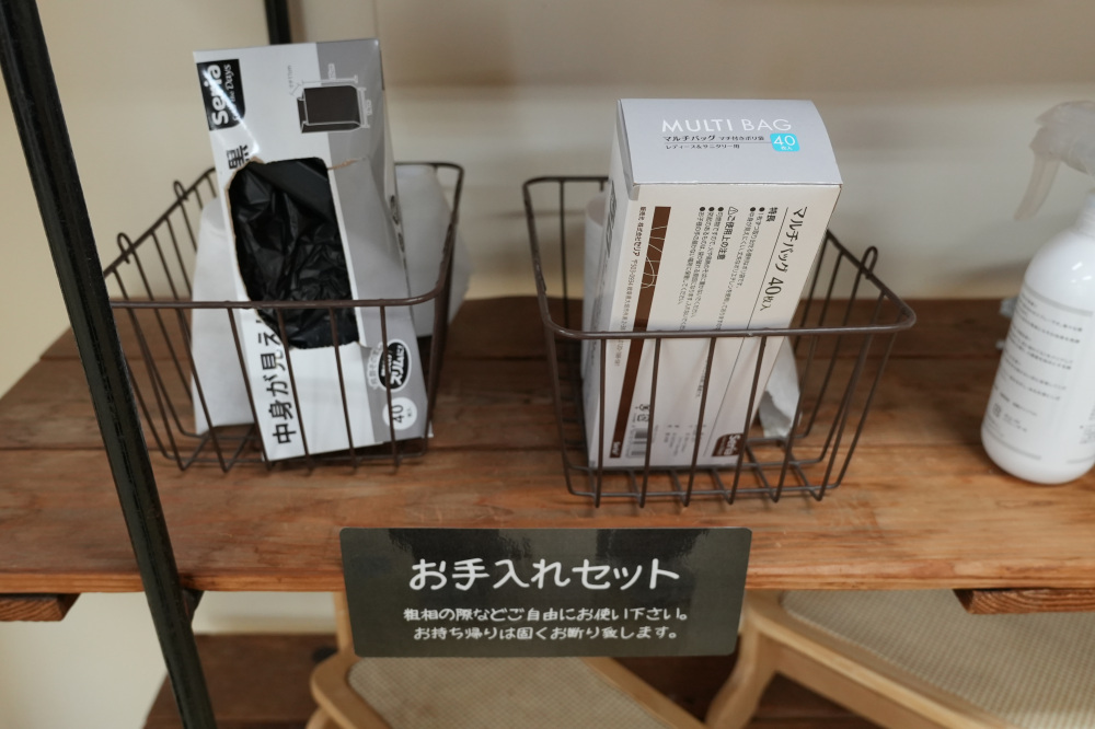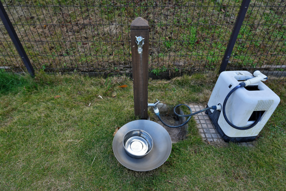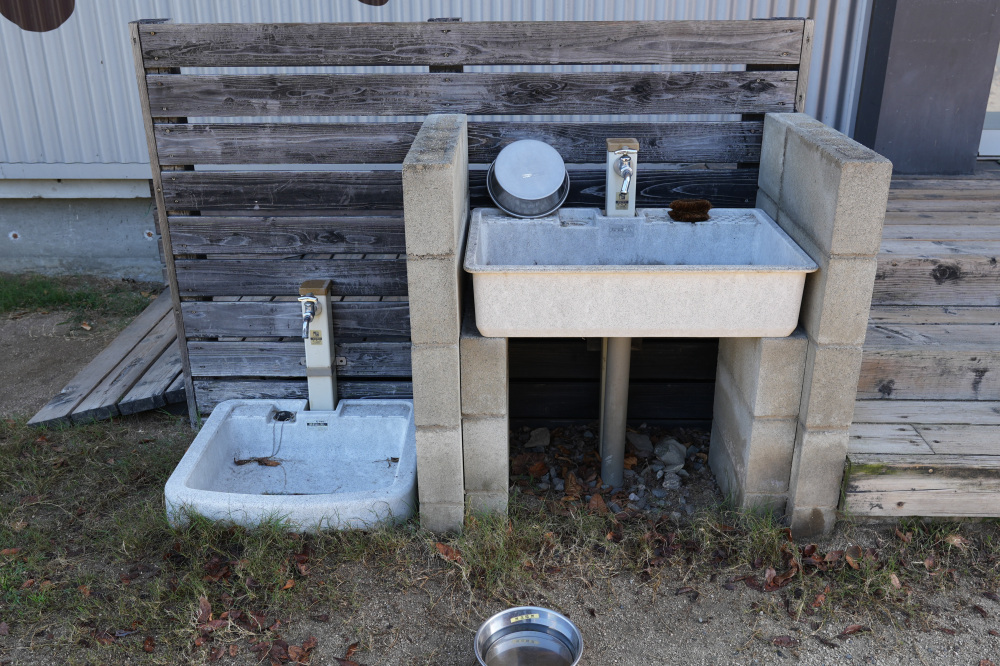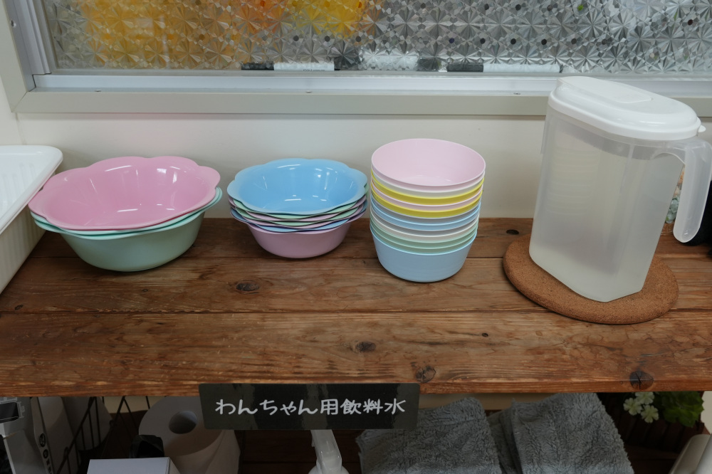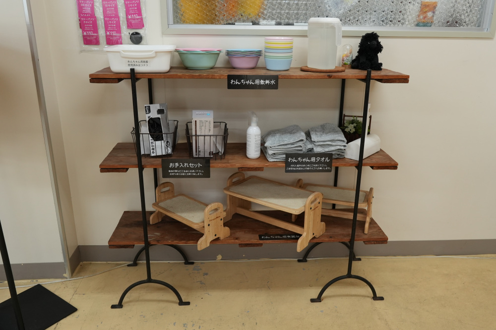 棚には、ワンちゃん用の飲料水や食器などが準備されており、ペットも人も安心して過ごすことができます。細やかな心遣いが嬉しいですね