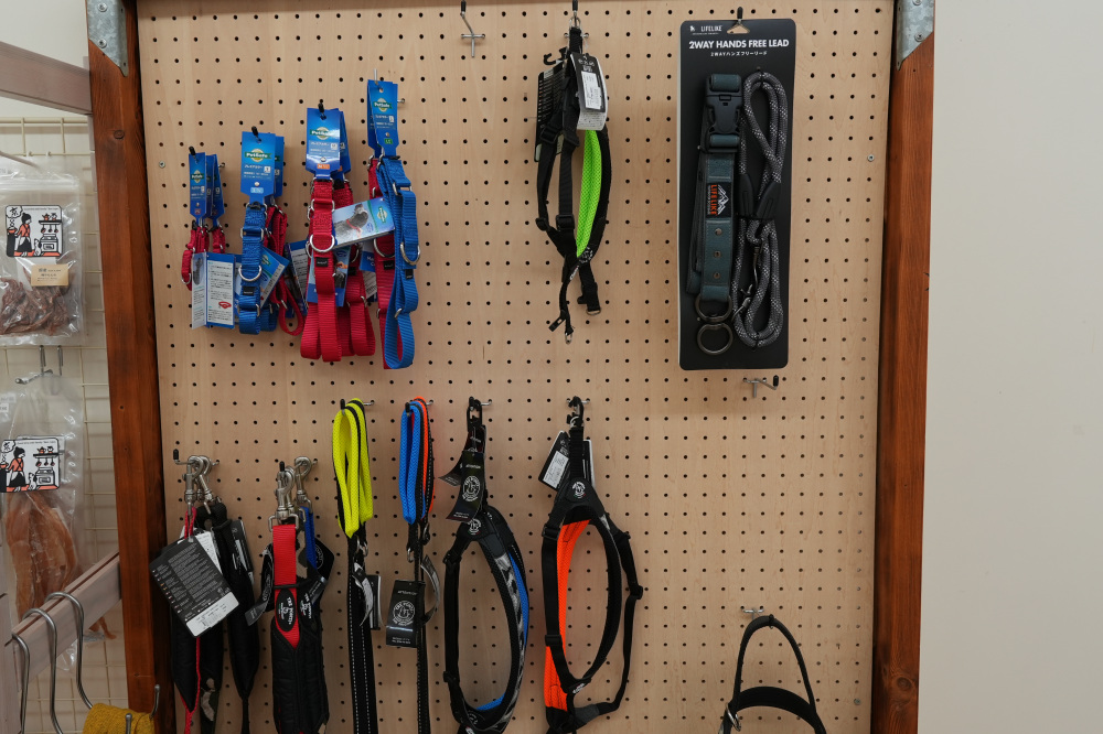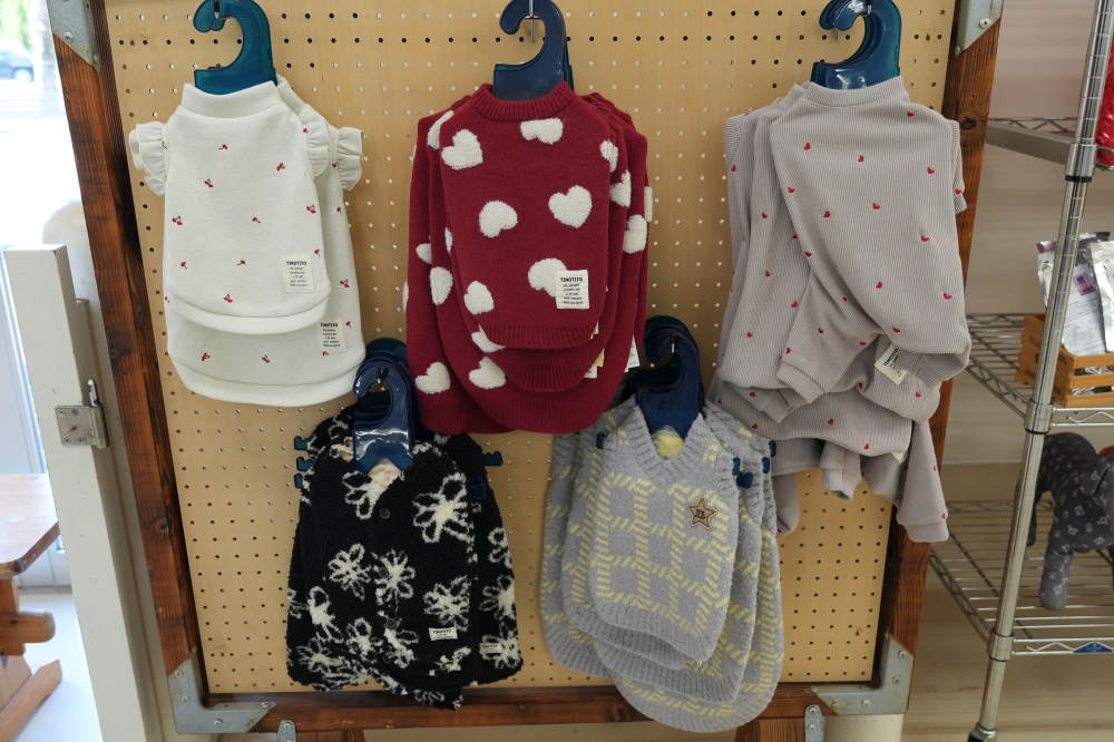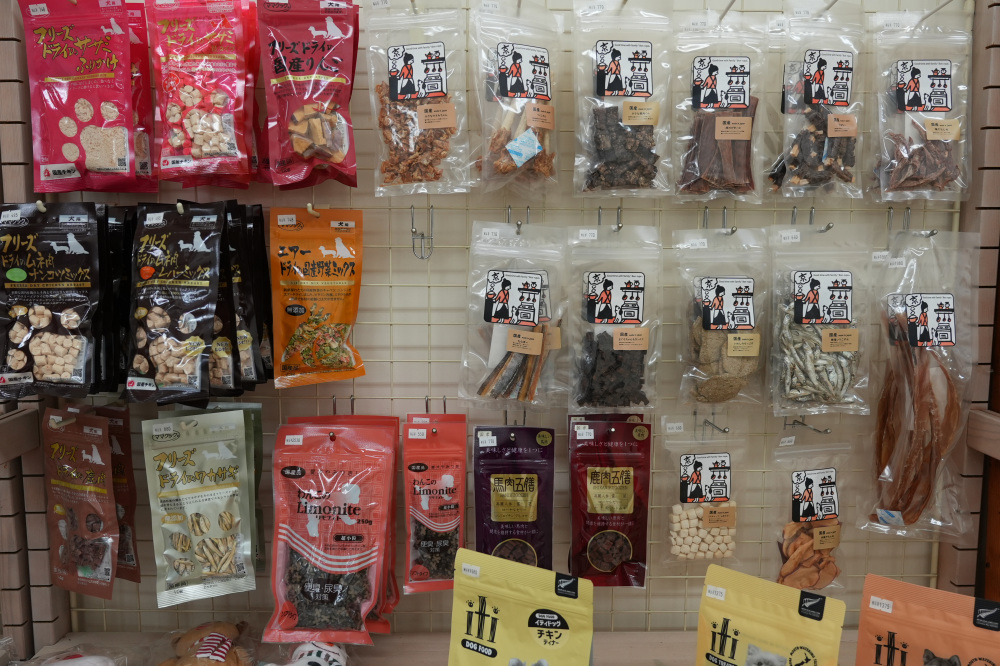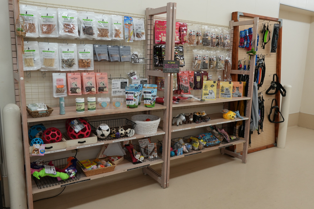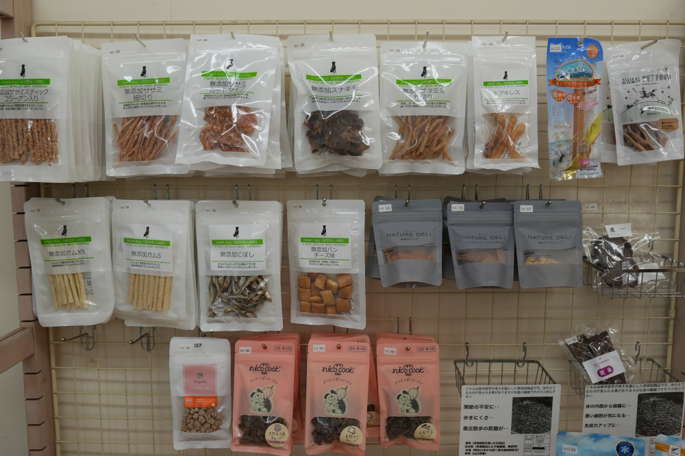 サロンの前にあるグッズ販売コーナーには、無添加素材のジャーキーなど、素材にこだわったおやつや、他の大型店には置いていないような厳選されたペットグッズが並んでいます。