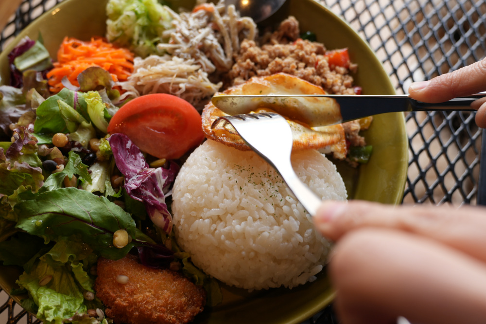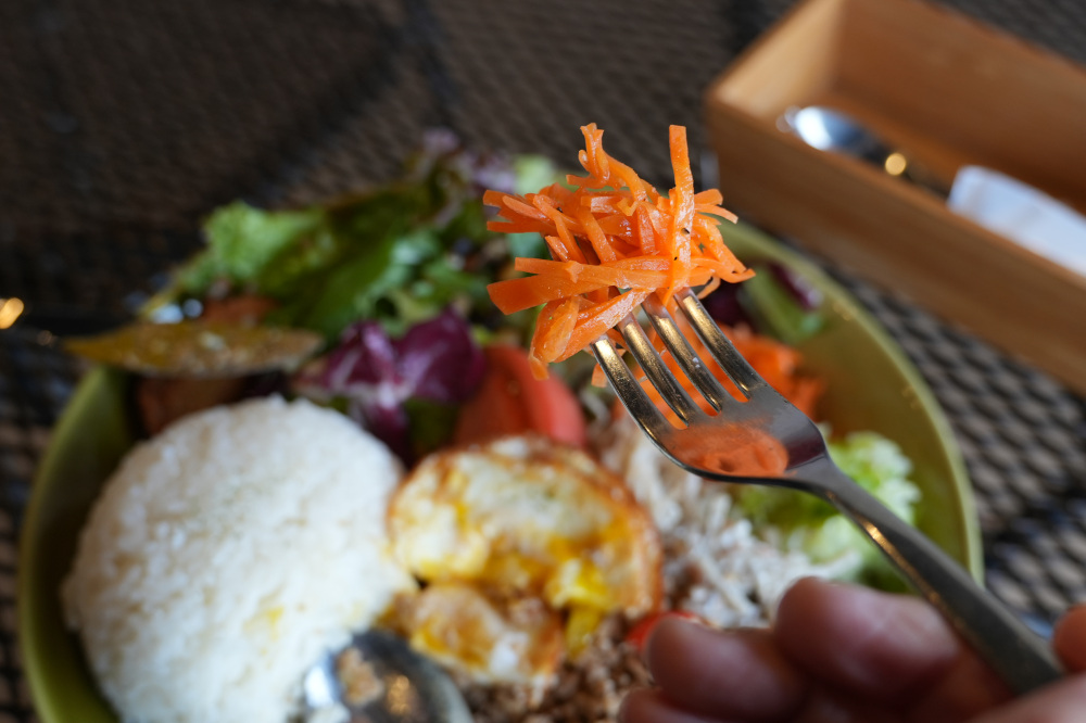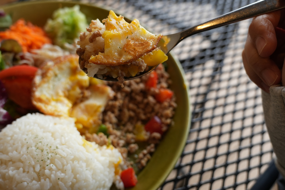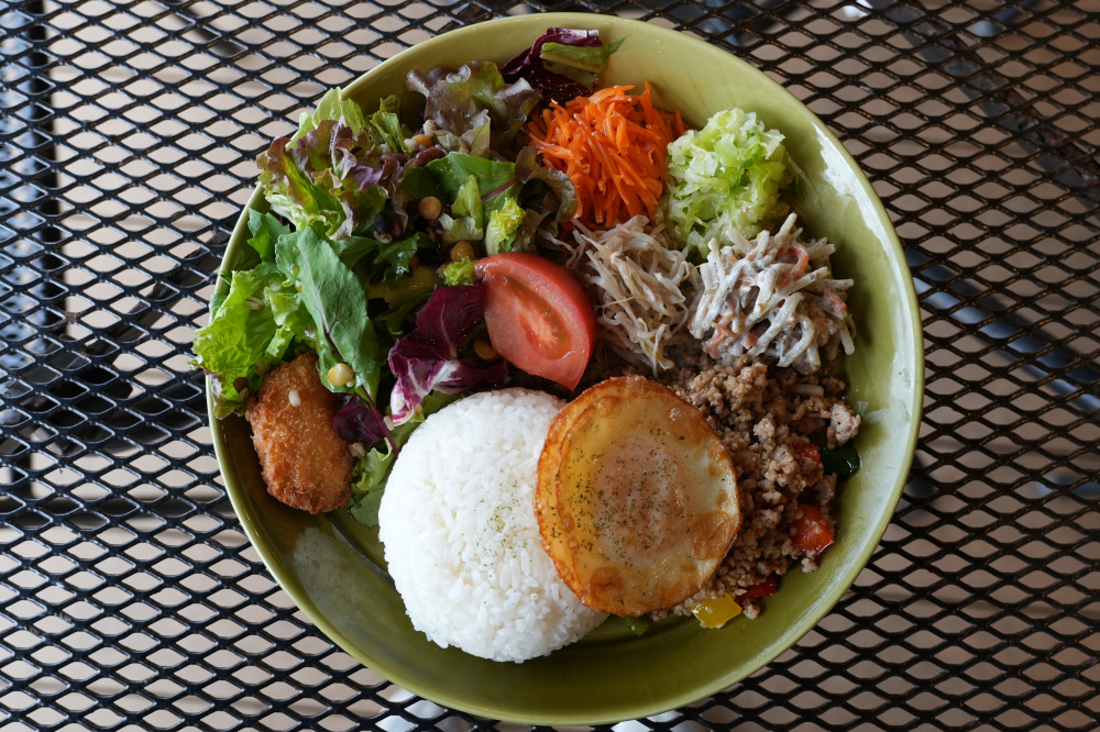 こちらのカフェでいただいたのは、毎日2種類から選べる日替わりプレート 1,500円です。常時あるプレートメニュー3種類各(各1,500円)も魅力的ですが、人気メニューと聞いて日替わりプレートのガパオライスを注文しました!