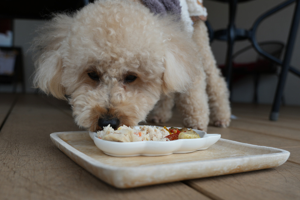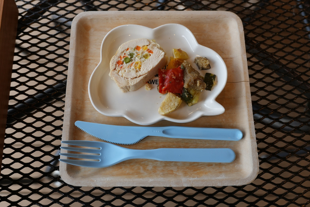 ドッグメニューは、こちらも一番人気のロールチキンプレート700円を注文しました!テーブルに届いた瞬間から、美味しそうな匂いがするのか、そわそわしています。