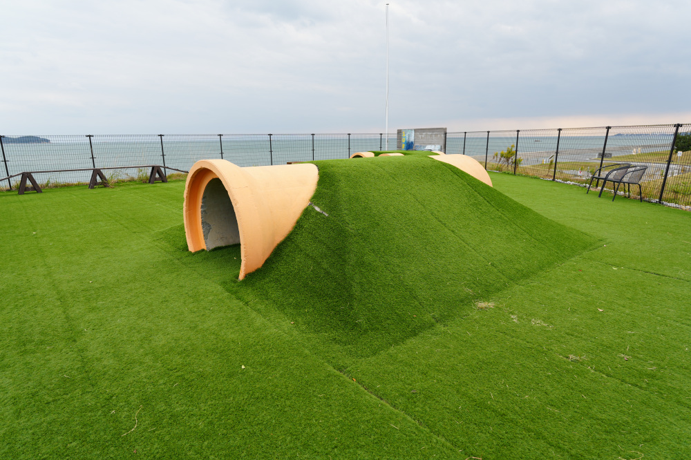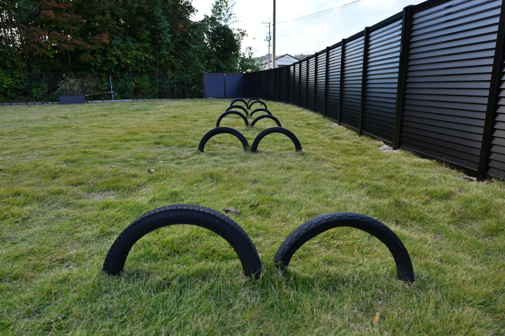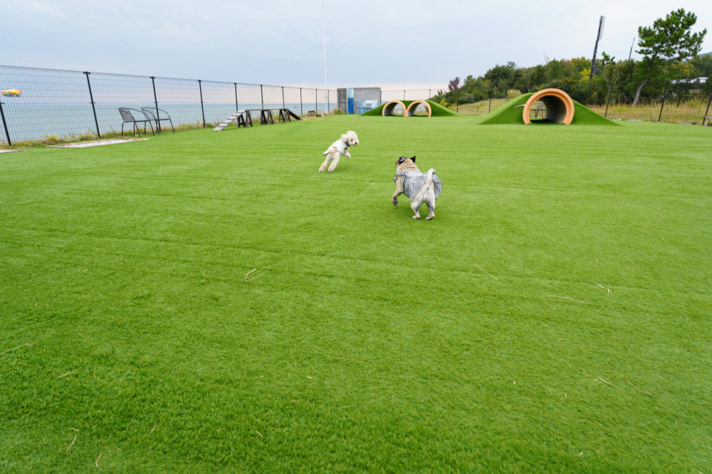 ドッグランは地面には人工芝が敷き詰められていて、足に優しく、トンネルやボールなどの遊具もたっぷり用意されているんですよ!