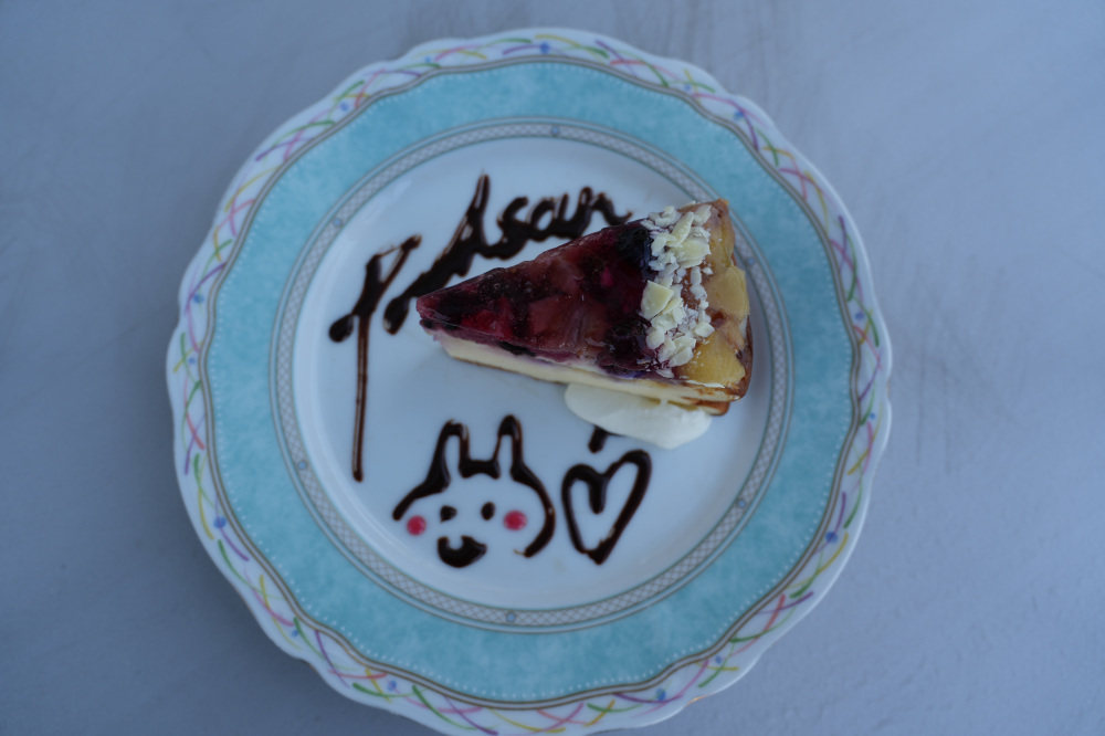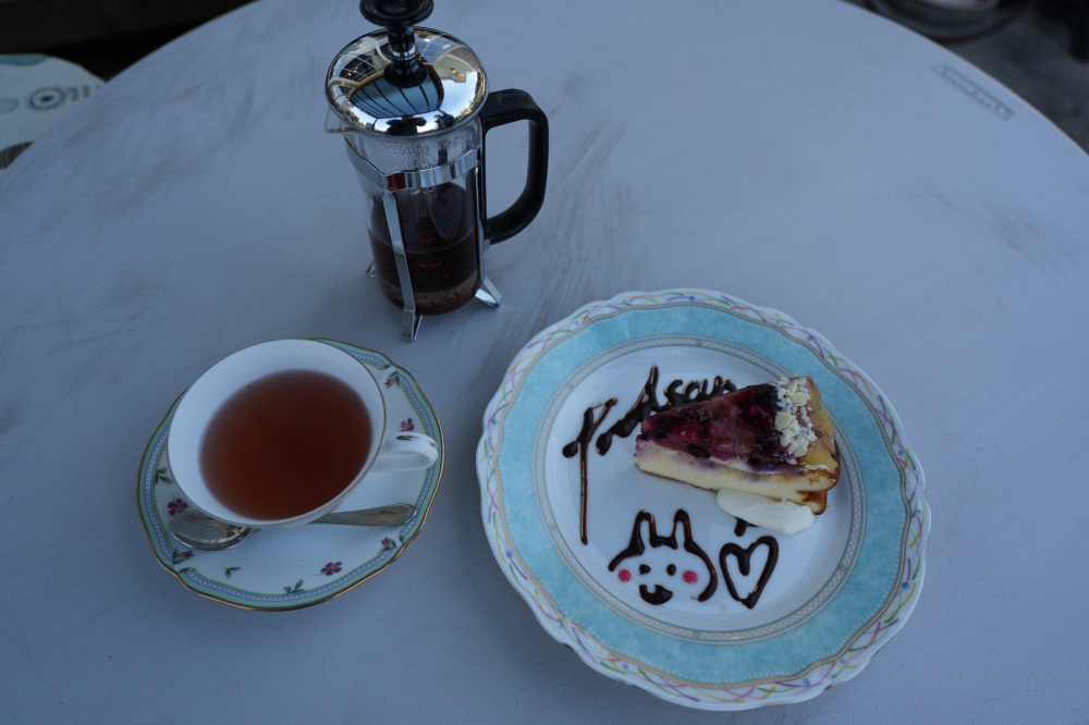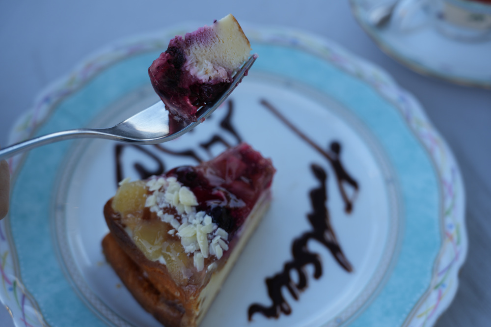 僕は、ベリーのチーズケーキとローズヒップティーをチョイスしました。お皿には、Poohsan(プーサン)という文字と、可愛いクマの絵がチョコレートでデコレーションしてあり、見た目も華やか!