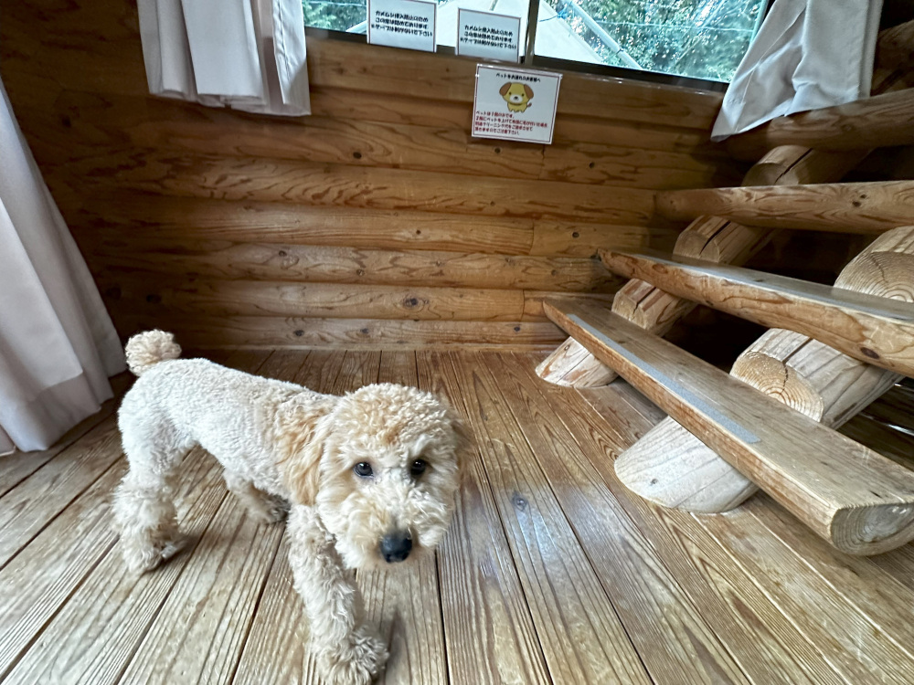 雨の日でも安心なのはもちろん、里親募集中の看板犬のゴマちゃんが迎えてくれることも!