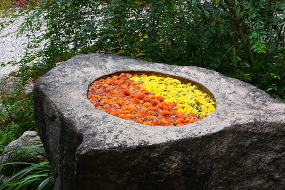 石の手水鉢には季節の草花が浮かべられていて、そのさりげない演出にも心がほぐれます。