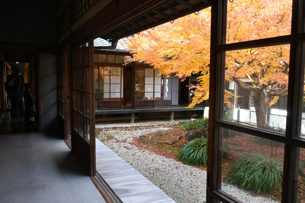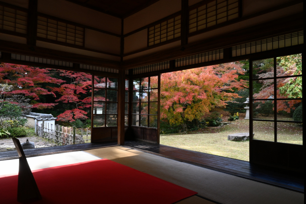 受付で入館手続きをすませて書院の間へと向かうと、まず目に飛び込んできたのは中庭の、ため息が出るほど美しい紅葉。