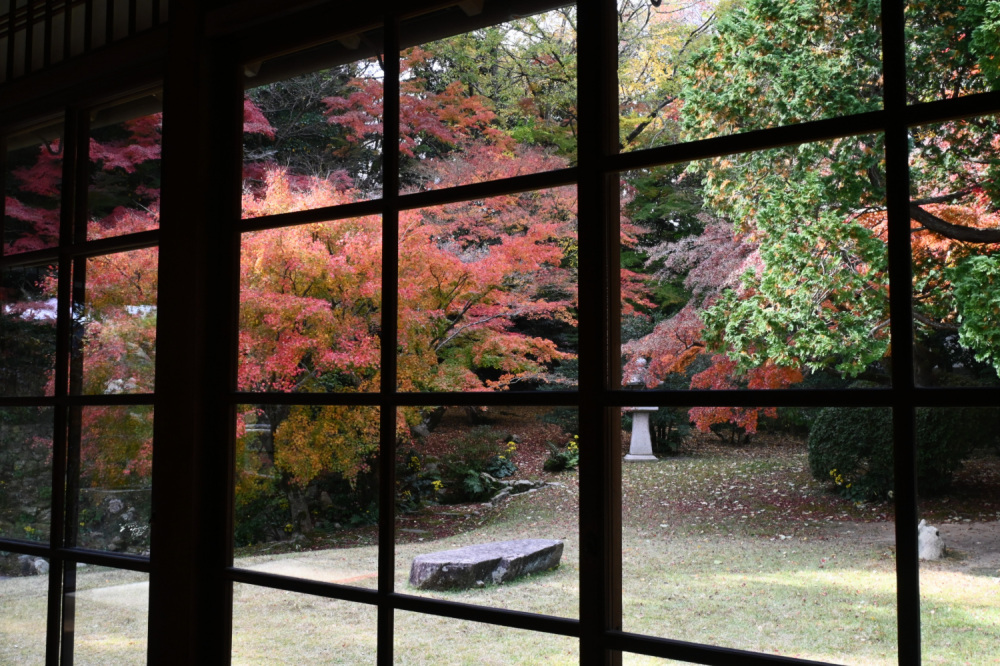 格子窓の向こうには、額縁に飾られた絵のような庭園の紅葉が視界いっぱいに広がっています