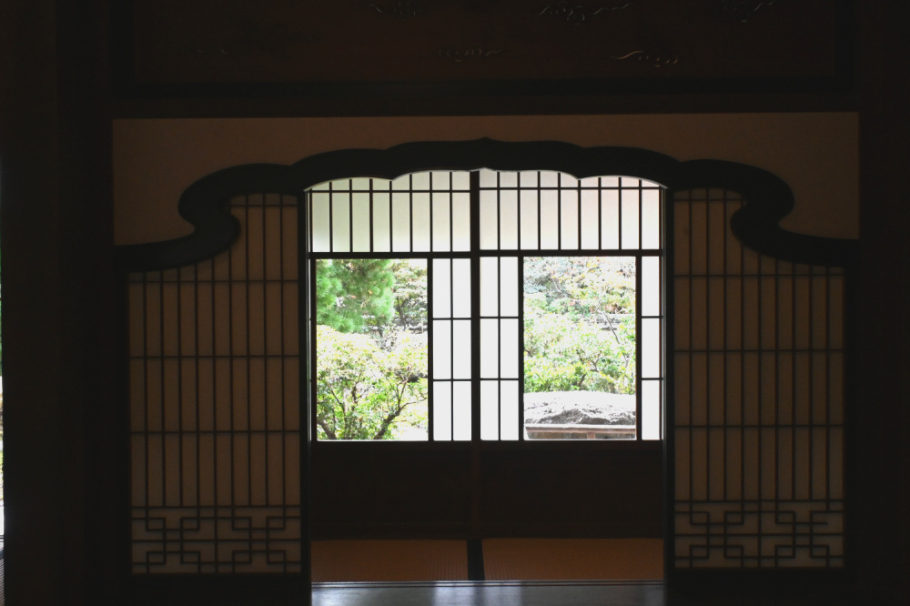 寺社建築に用いられる「華頭窓(かとうまど)」が、外の景色を美しく切り取っています。