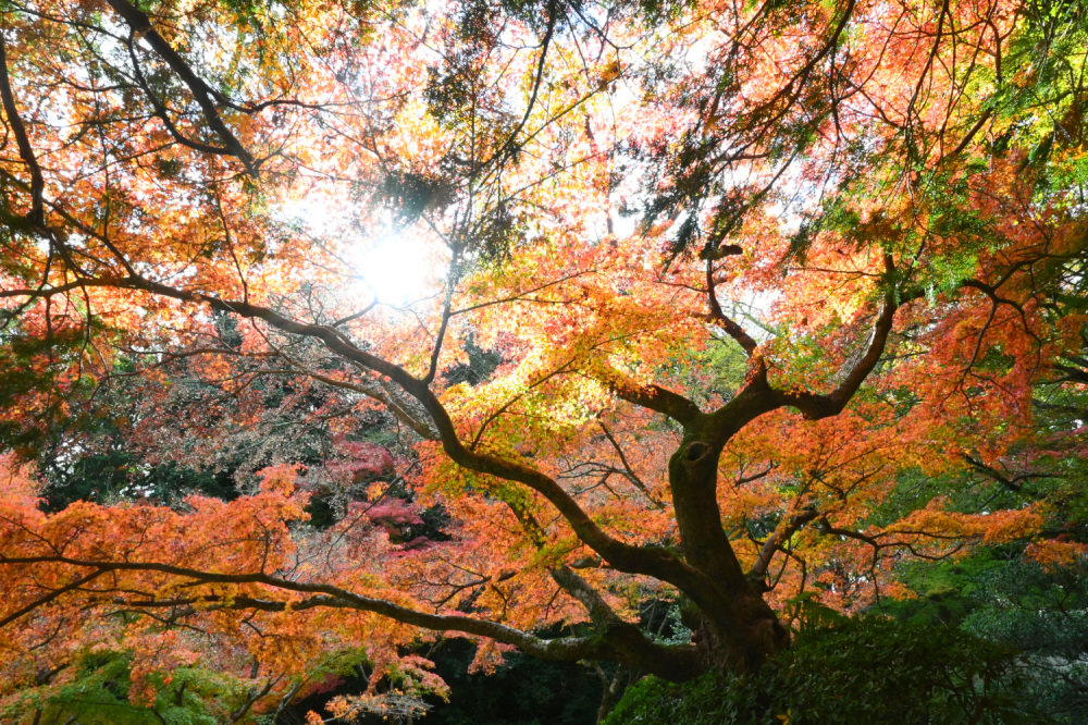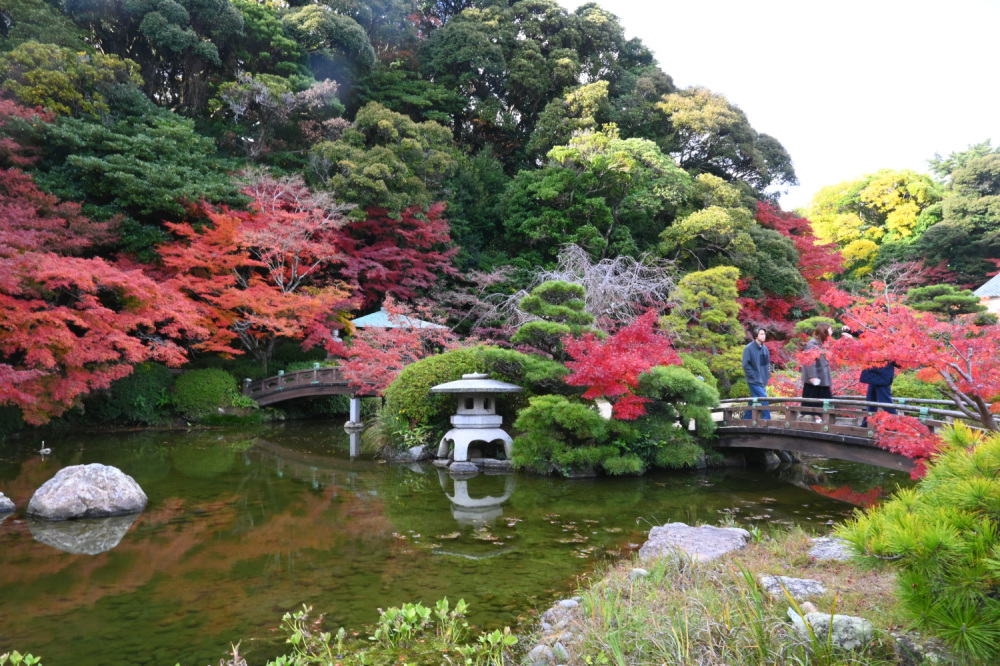 11月中旬〜12月上旬頃には約150本ものモミジが色づき、池に映る“鏡紅葉”が秋の庭園美を一段と引き立てます。
