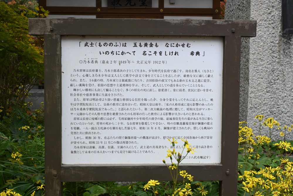 説明看板によると、乃木将軍は幼少期をこの長府の地で過ごし、退役後の晩年は学習院長として教育に携わり、昭和天皇の人格形成にも大きな影響を与えたそう。