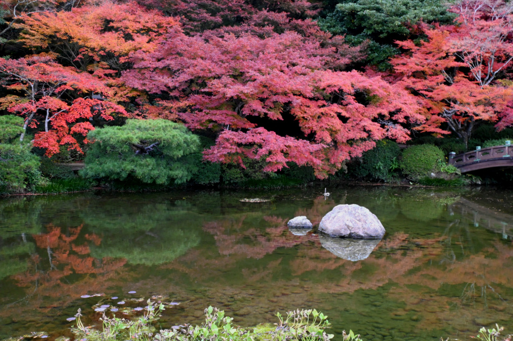 池泉回遊式庭園の池には色づいた木々が映り込み、ゆらゆらと水面が秋を揺らしていました。