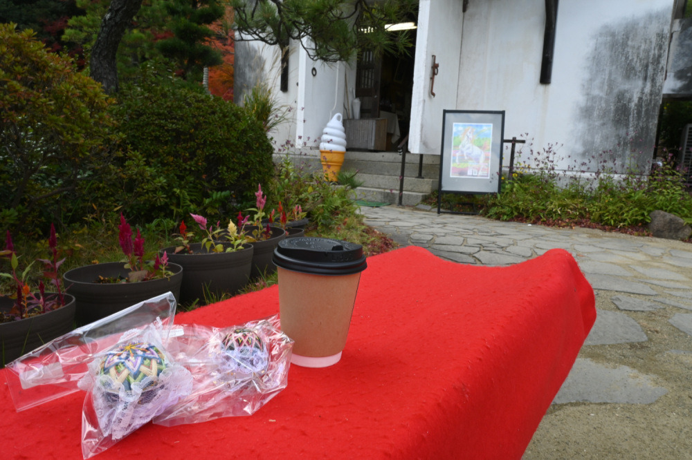 この日はコーヒーをテイクアウトして、外の赤い和傘の下でひと息。