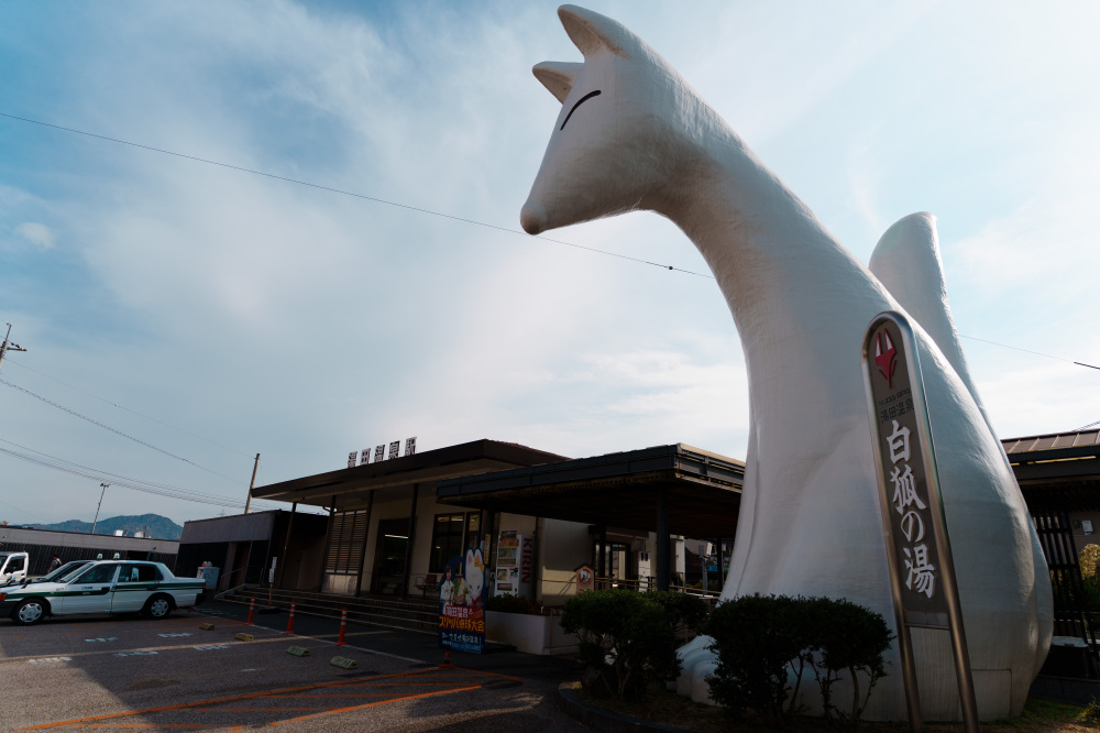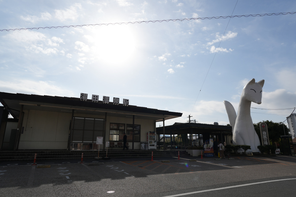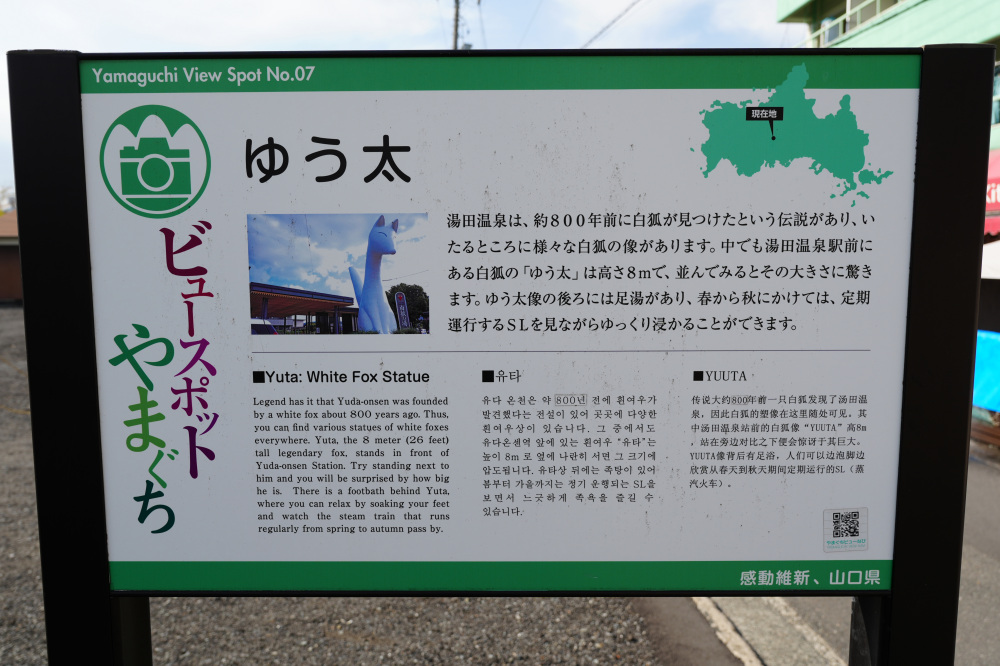 駅前には高さ8mもある白狐のモニュメント「ゆう太くん」が堂々と立ち、訪れた瞬間から湯田温泉らしい雰囲気が感じられます!さらに、白狐をモチーフにしたポストもあって写真映えするスポットとしてもおすすめです♪