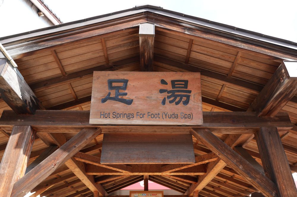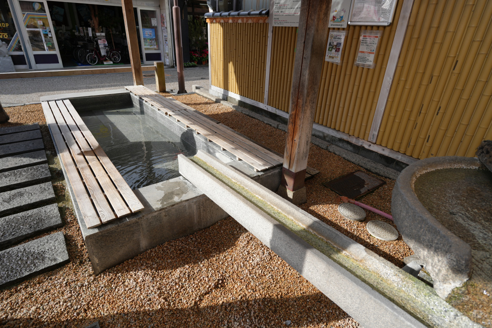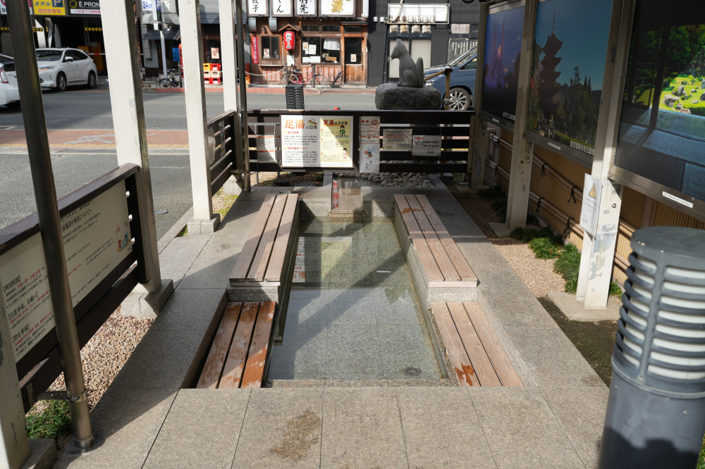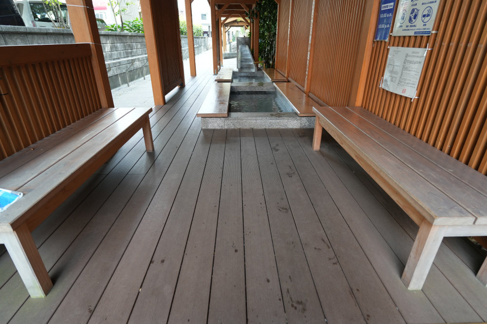 手湯の先にある足湯は、奥行きがある広い造りになっています。木の縦格子があるので、通り沿いながらも周囲の視線を気にせずのんびり入れますよ!