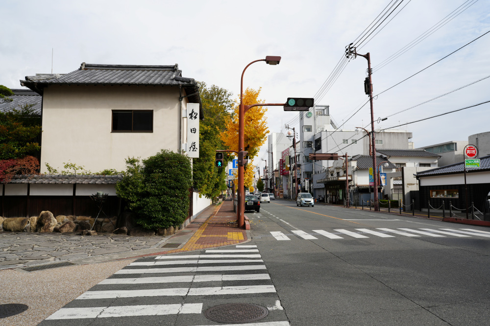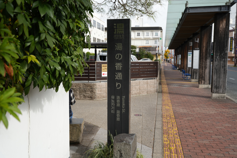 観光案内所前の足湯から、湯の町街道を北東へ歩くこと約3分(200m)。松田屋ホテルとユウベルホテル松政の間にある静かな路地「湯の香通り」に入ります。