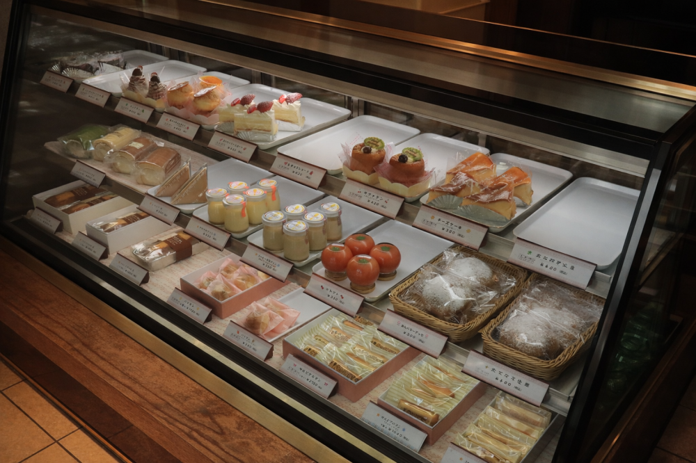 ショーケースには、和菓子から洋菓子、焼き菓子まで、種類豊富な菓子がずらり。
