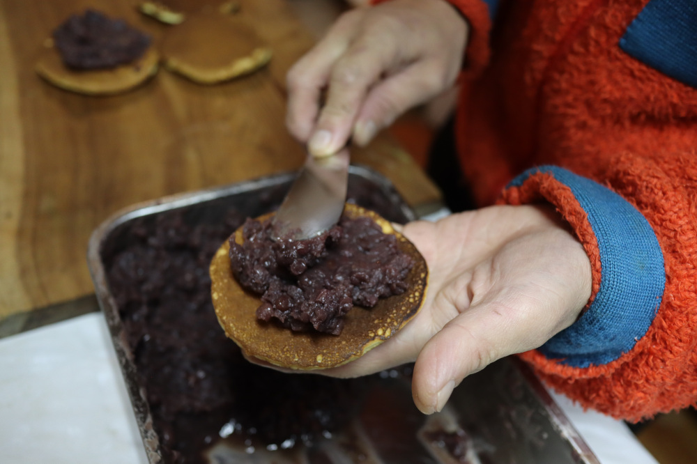 取材のため特別に、どら焼き作りの工程を見せていただきました。北海道産の小豆を使用し、丁寧に炊き上げた粒あんとバターを、ふわふわの生地にそっと挟んでいく様子は、思わず見入ってしまうほど。完成を待つ時間さえも、楽しみに感じられます。