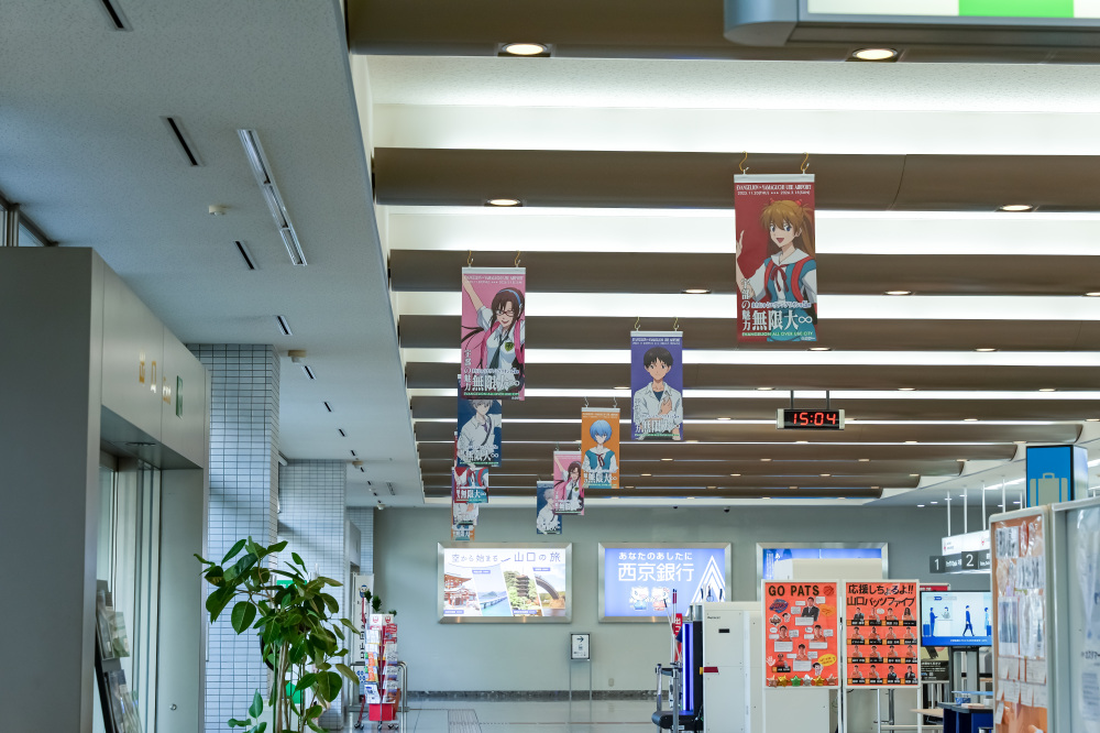 山口県の空の玄関口「山口宇部空港」にも、「まちエヴァ」の期間はエヴァンゲリオンの装飾が!1Fの手荷物預かりエリアには、キャラクターが描かれたたくさんの旗も飾られています。