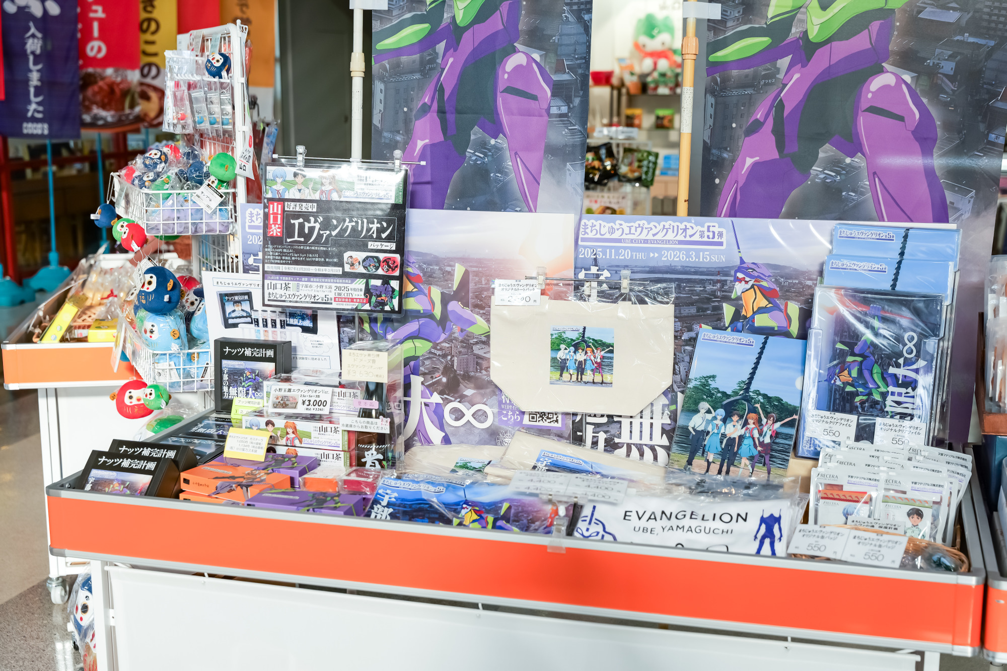 ポップアップショップを入ってすぐの棚には、地元のお店とエヴァンゲリオンがコラボした今回限定の商品がずらり。あまりの人気に品切れになるものも多いそうで、再入荷待ちの商品も !宇部市内やこのお店でしか買えないものもあるので、ぜひチェックしてみてくださいね。
