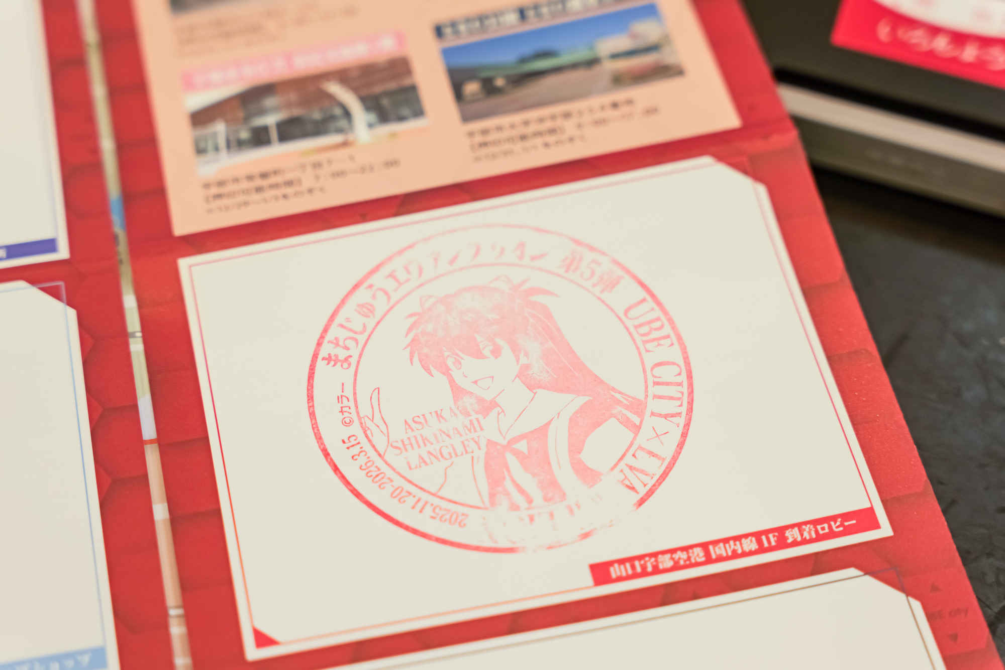 今回の「まちエヴァ」では、宇部市内を巡って楽しむ「うべまちめぐりスタンプラリー」も開催。⼭⼝宇部空港の国内線1Fの到着ロビーでは、全5ヶ所のスタンプのうち、アスカのデザインのスタンプが設置されていますよ。