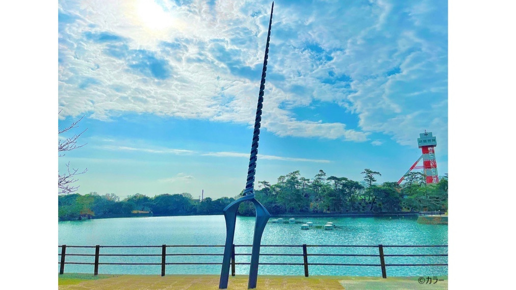 また、同じくときわ公園内の「ときわ湖水ホール」にはカヲルのスタンプが、常盤橋付近(石炭記念館側)には「まちエヴァ」の第3弾で話題を呼んだ「ロンギヌスの槍」が設置されているので、こちらもぜひGO!!